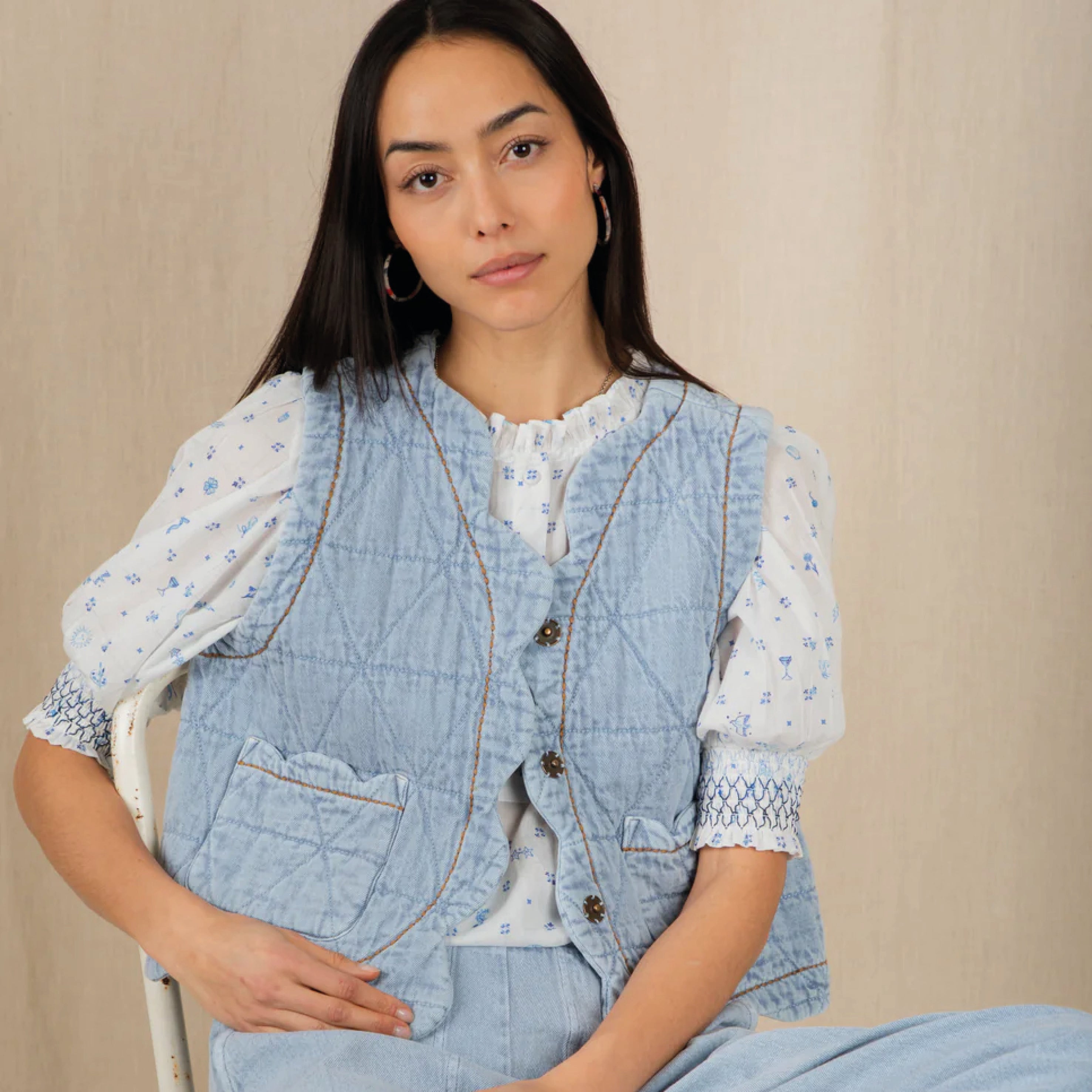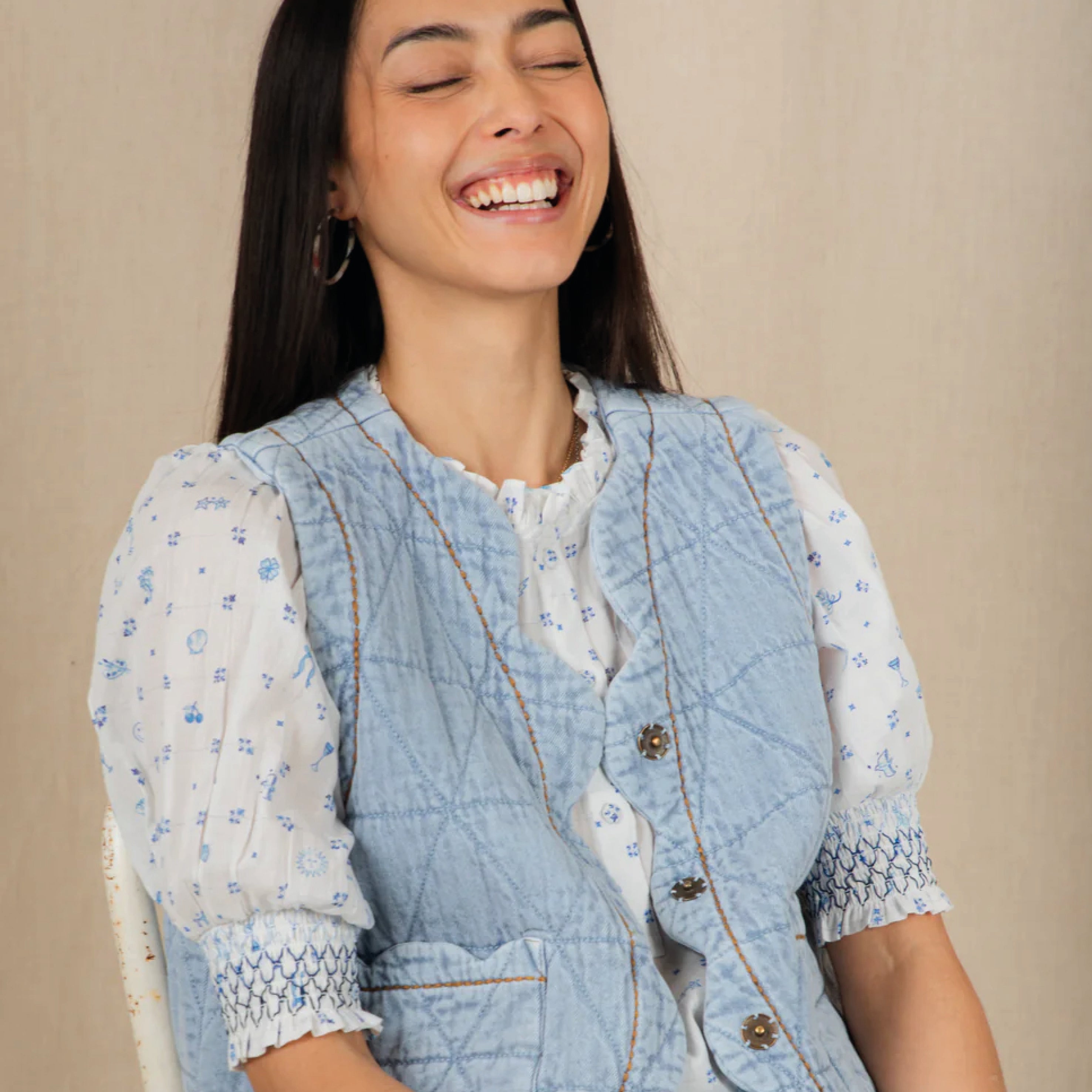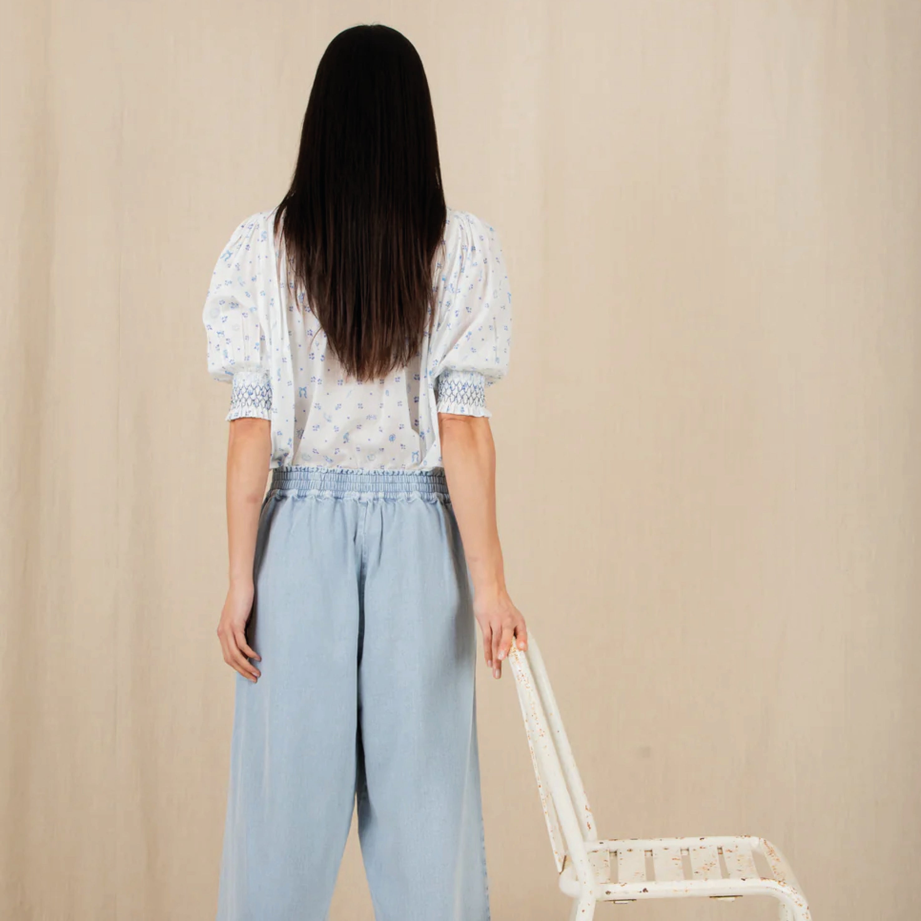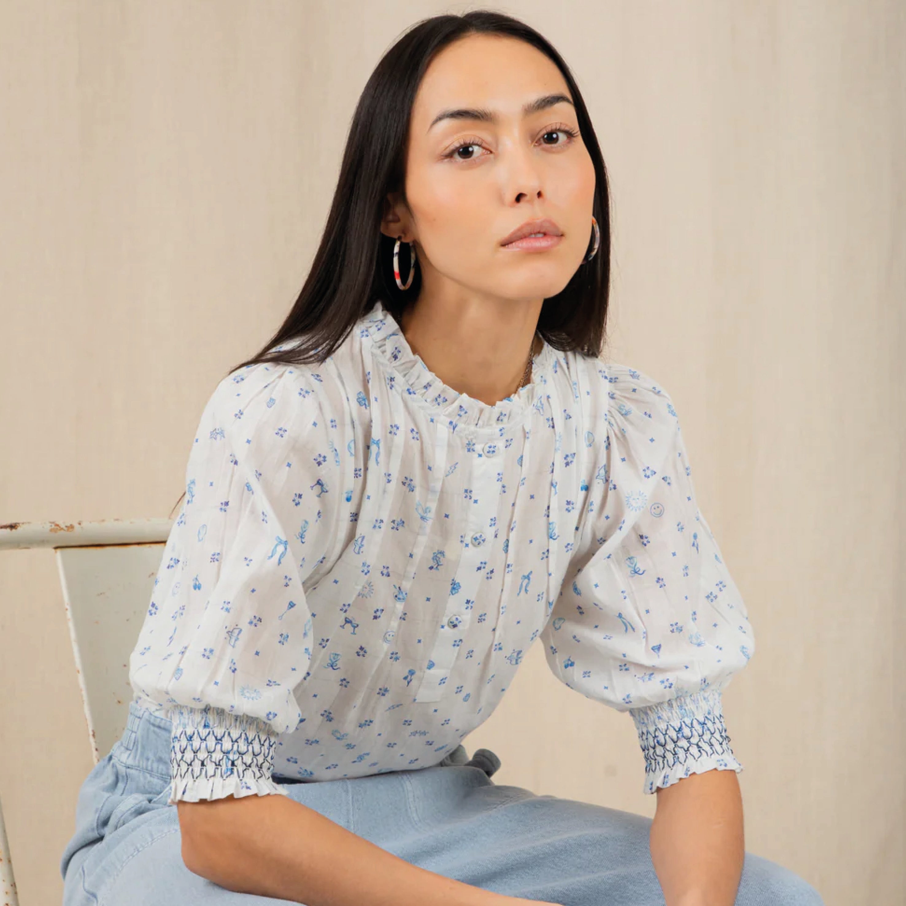 The feminine, cotton Bonté Delft Loane Shirt features a detailed hand-painted print, with a frill collar and tucks around the neck and a half placket opening with covered buttons. The short sleeve is designed to be worn just above the elbow with a contrast smocking detail. Loose fitting, great tucked in or worn out.