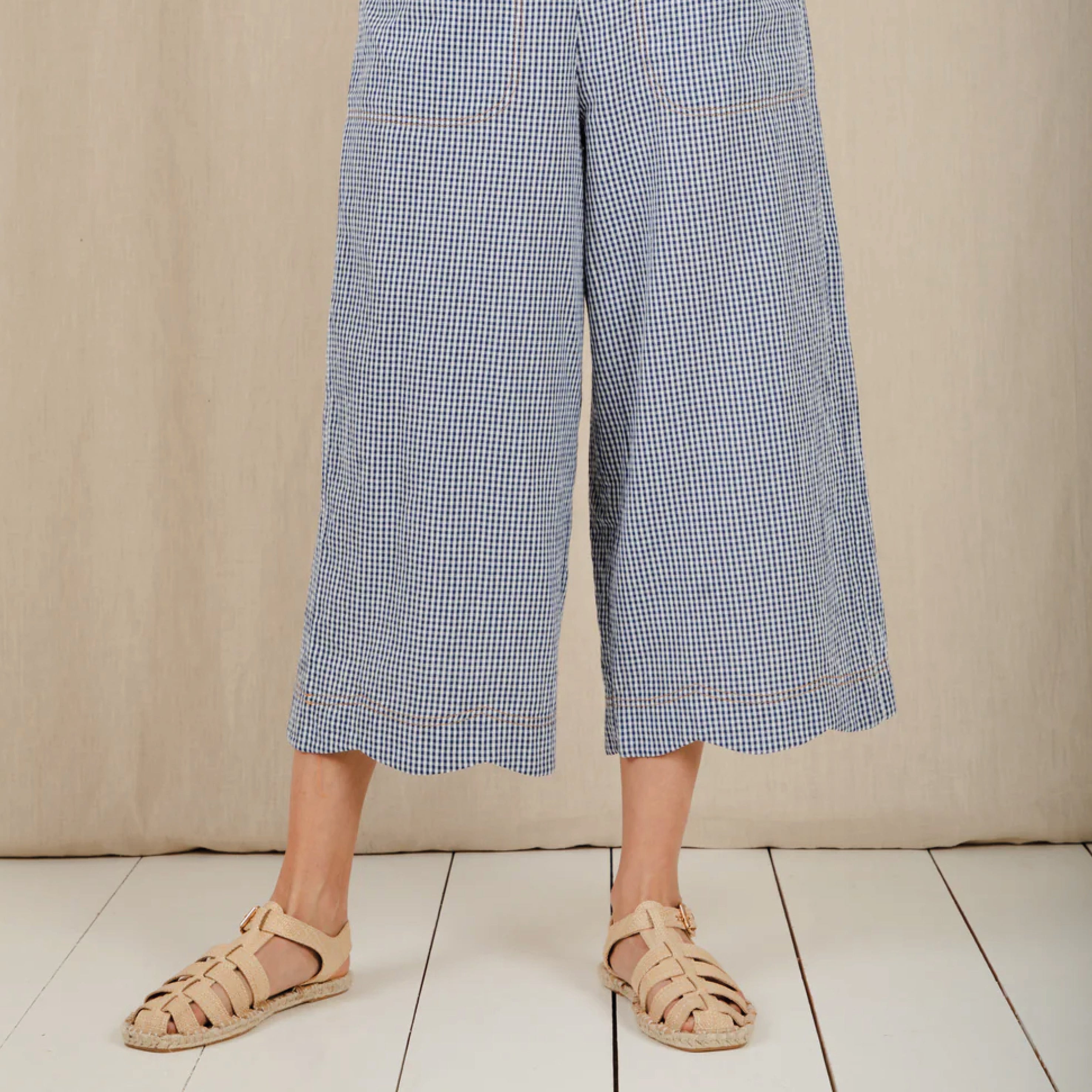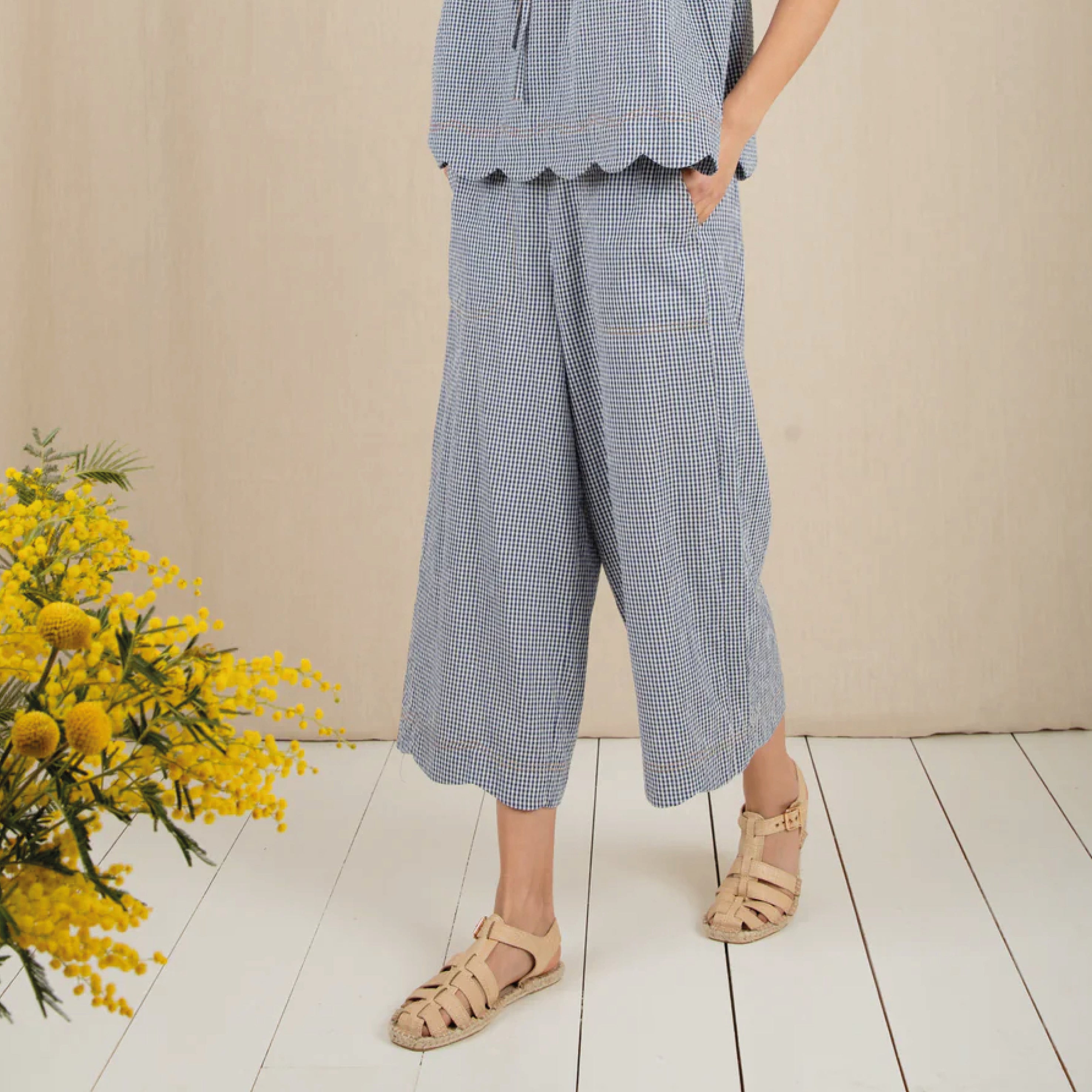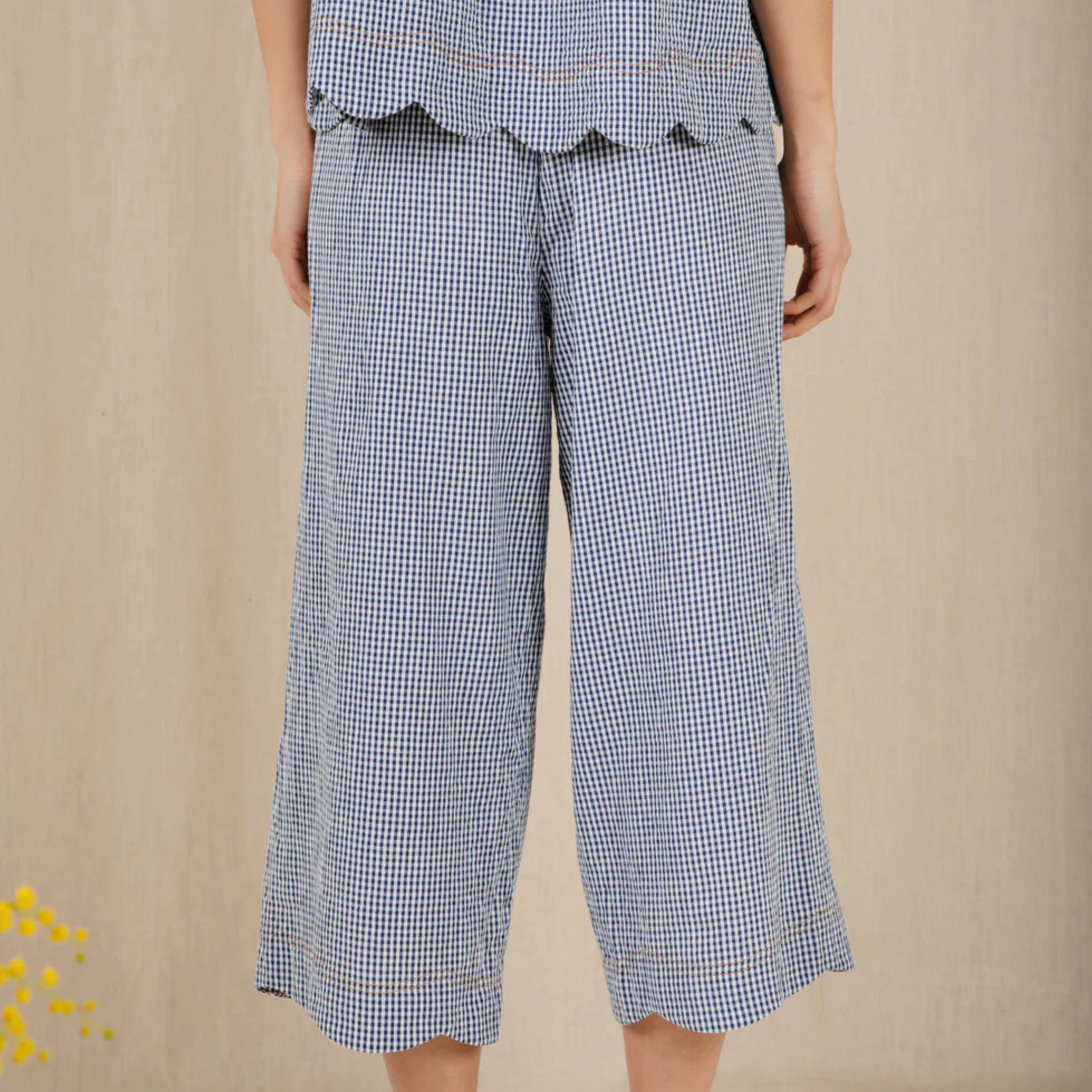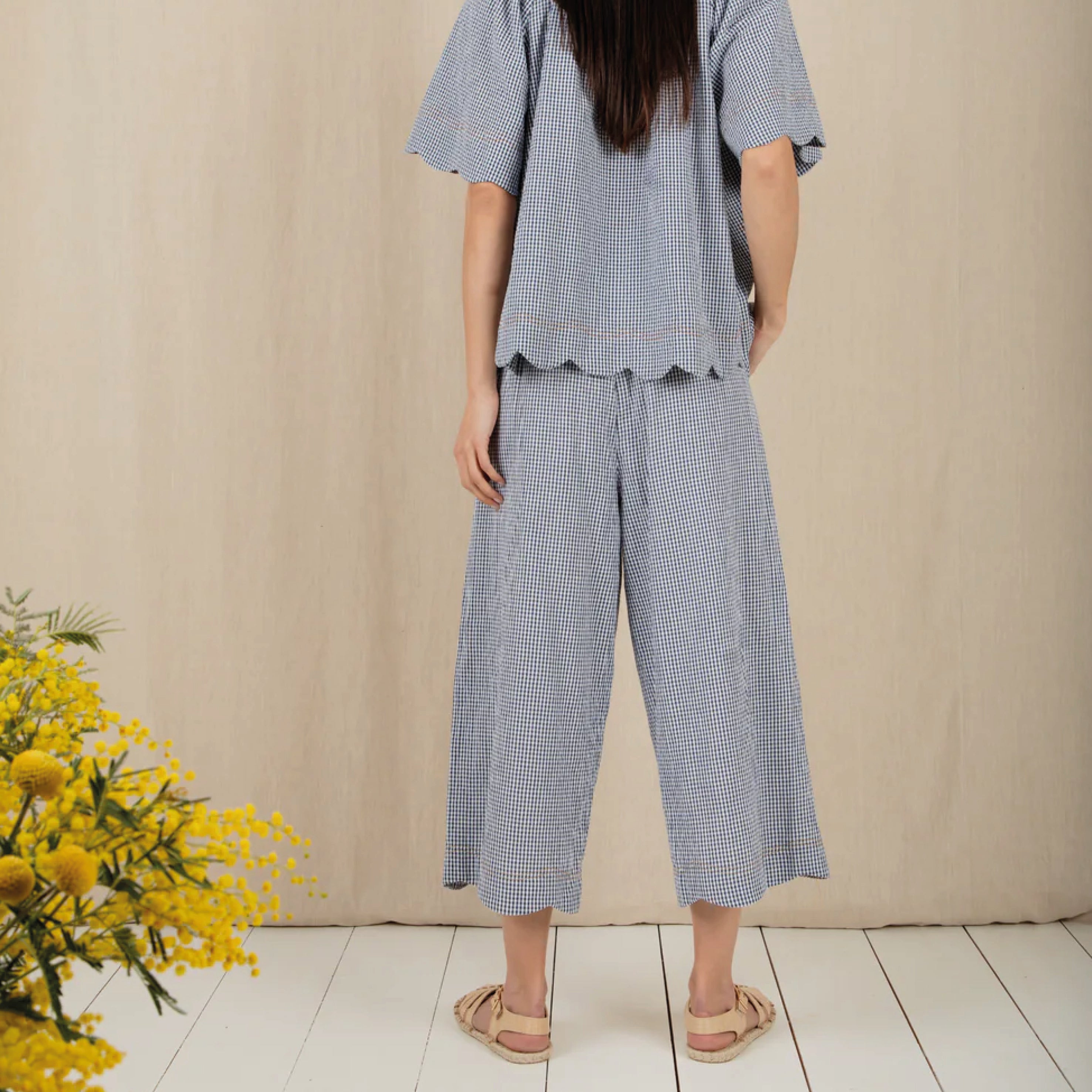 The Bonté Navy Gingham Aide Trousers are loose and relaxed fitting, 3/4 length, wide leg pull on trousers in organic cotton seersucker gingham. Featuring an elasticated back for a comfortable fit and a feminine scallop hem detail.