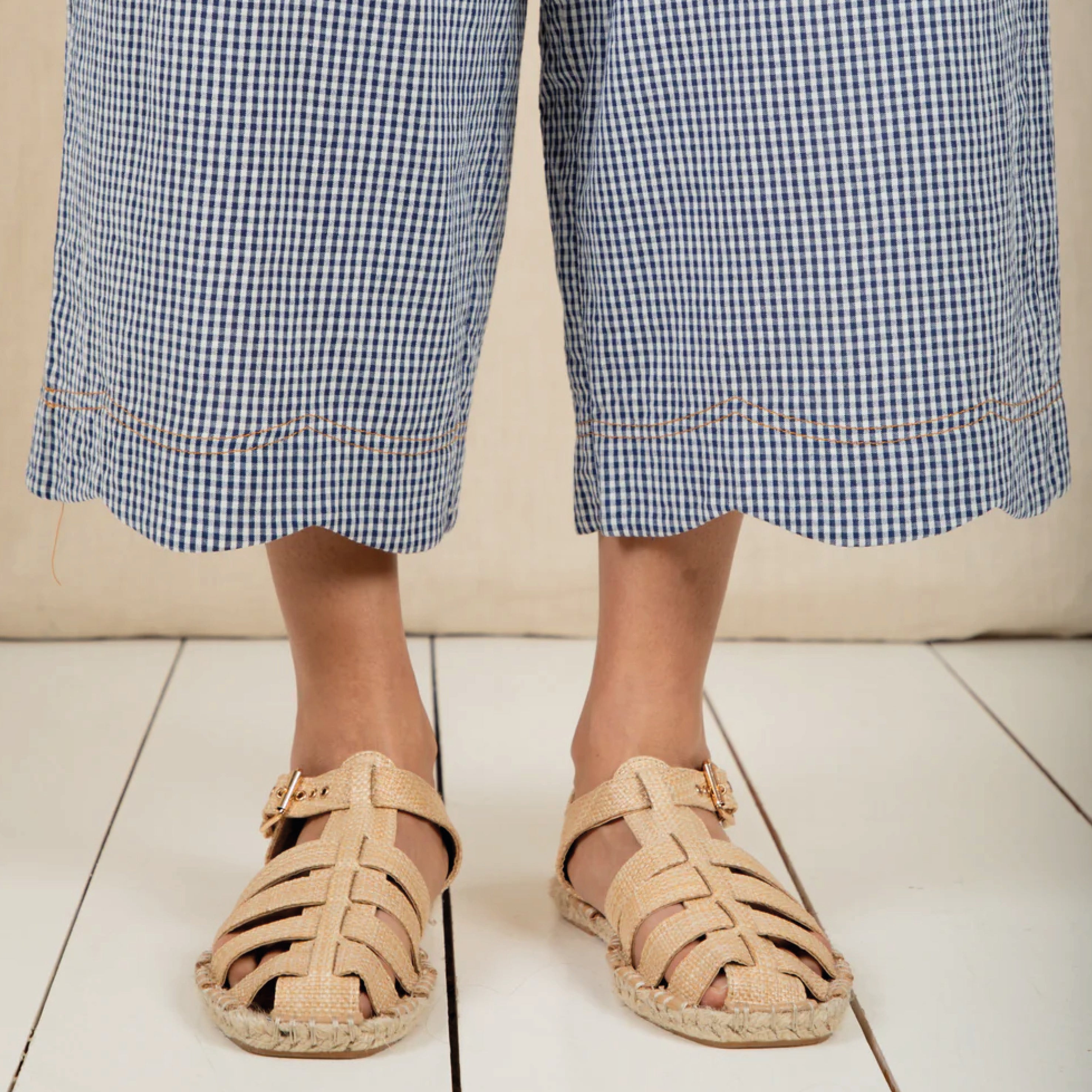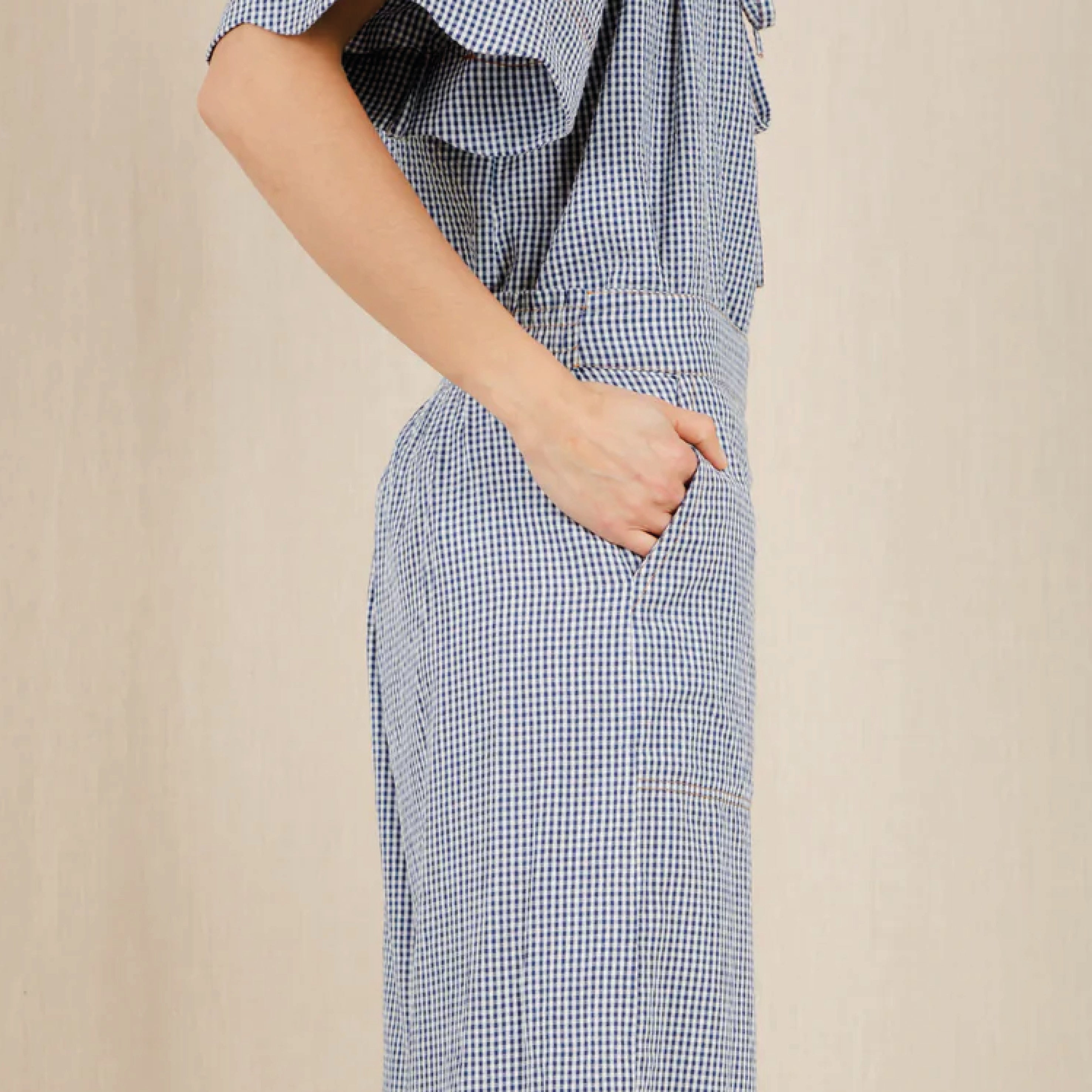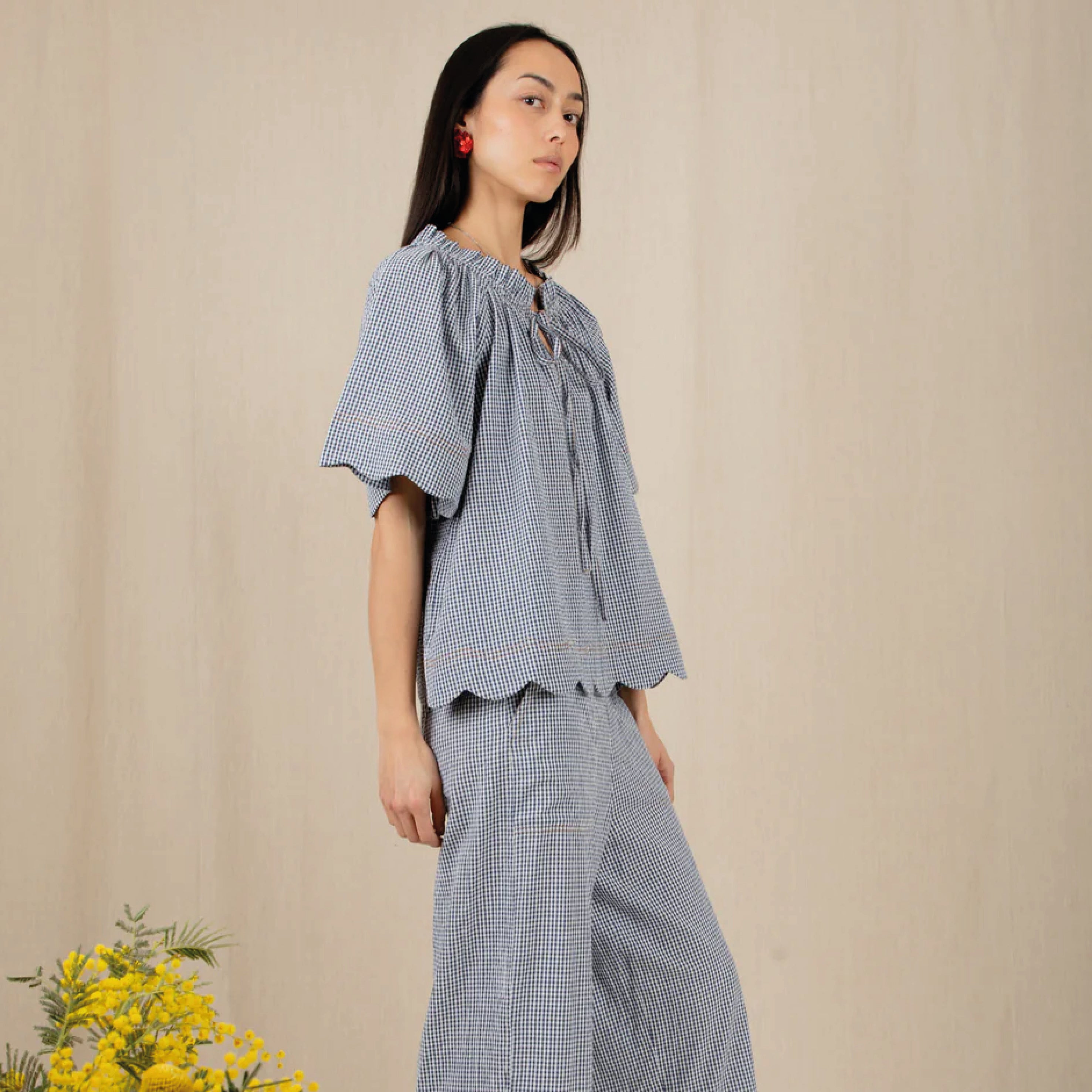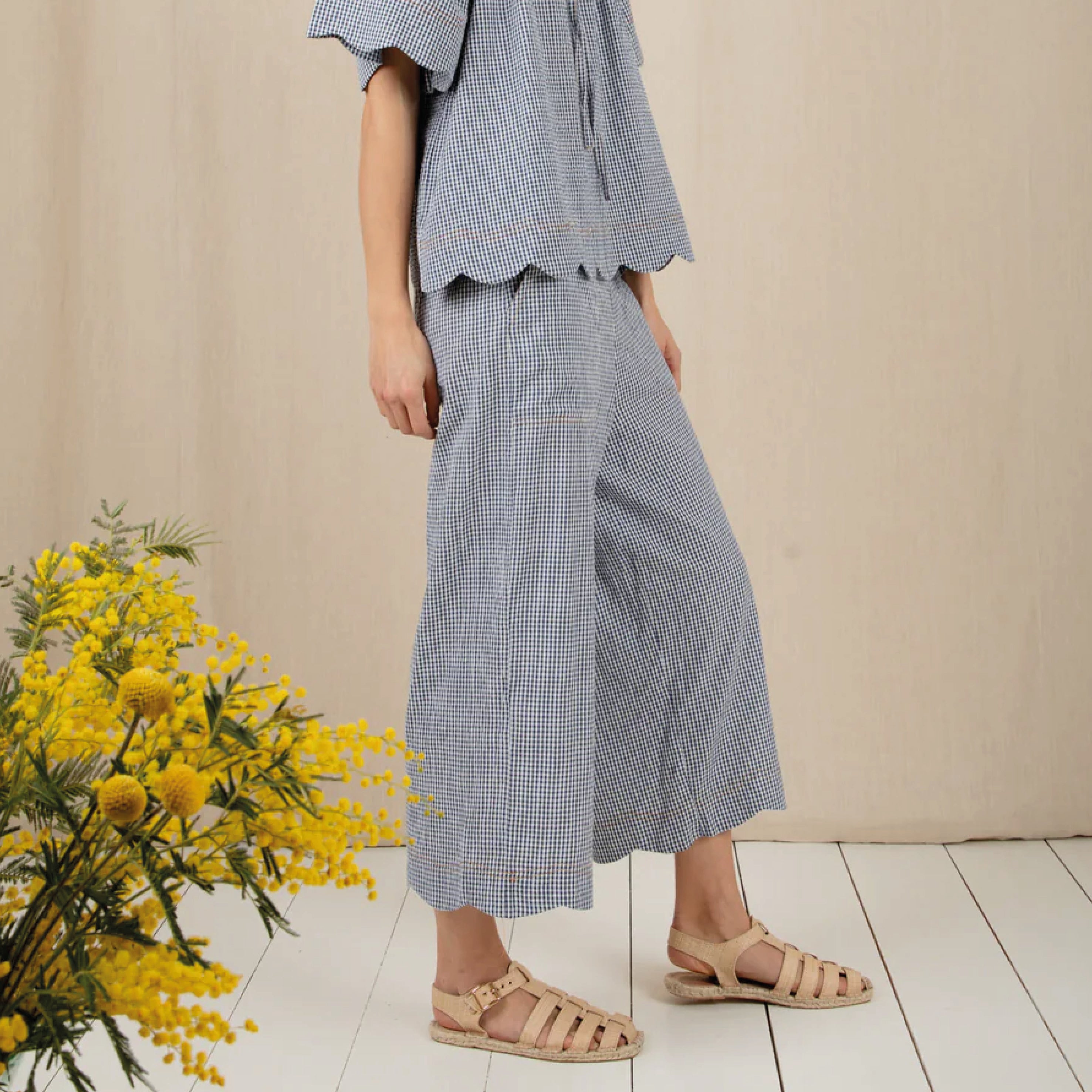 The Bonté Navy Gingham Aide Trousers are loose and relaxed fitting, 3/4 length, wide leg pull on trousers in organic cotton seersucker gingham. Featuring an elasticated back for a comfortable fit and a feminine scallop hem detail.