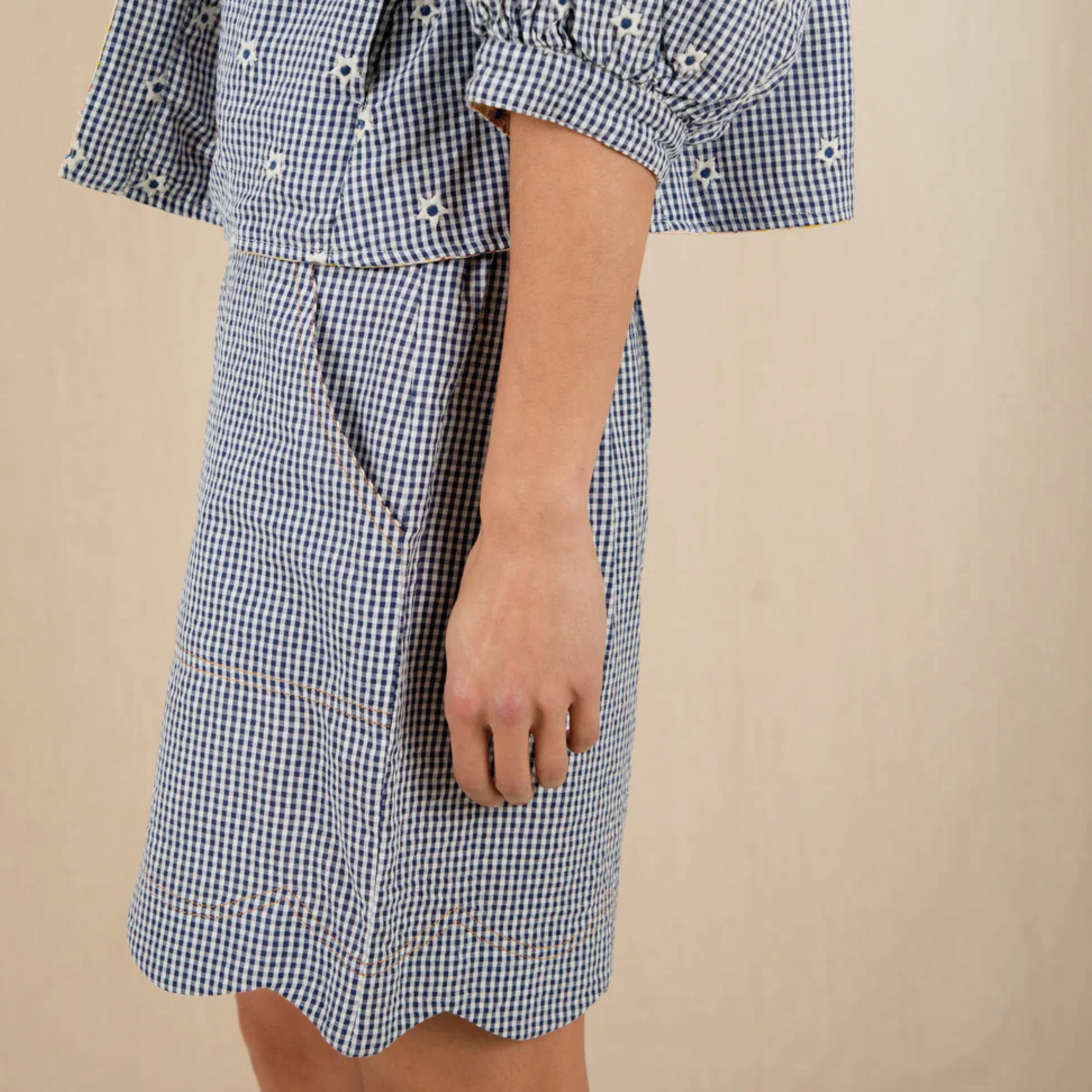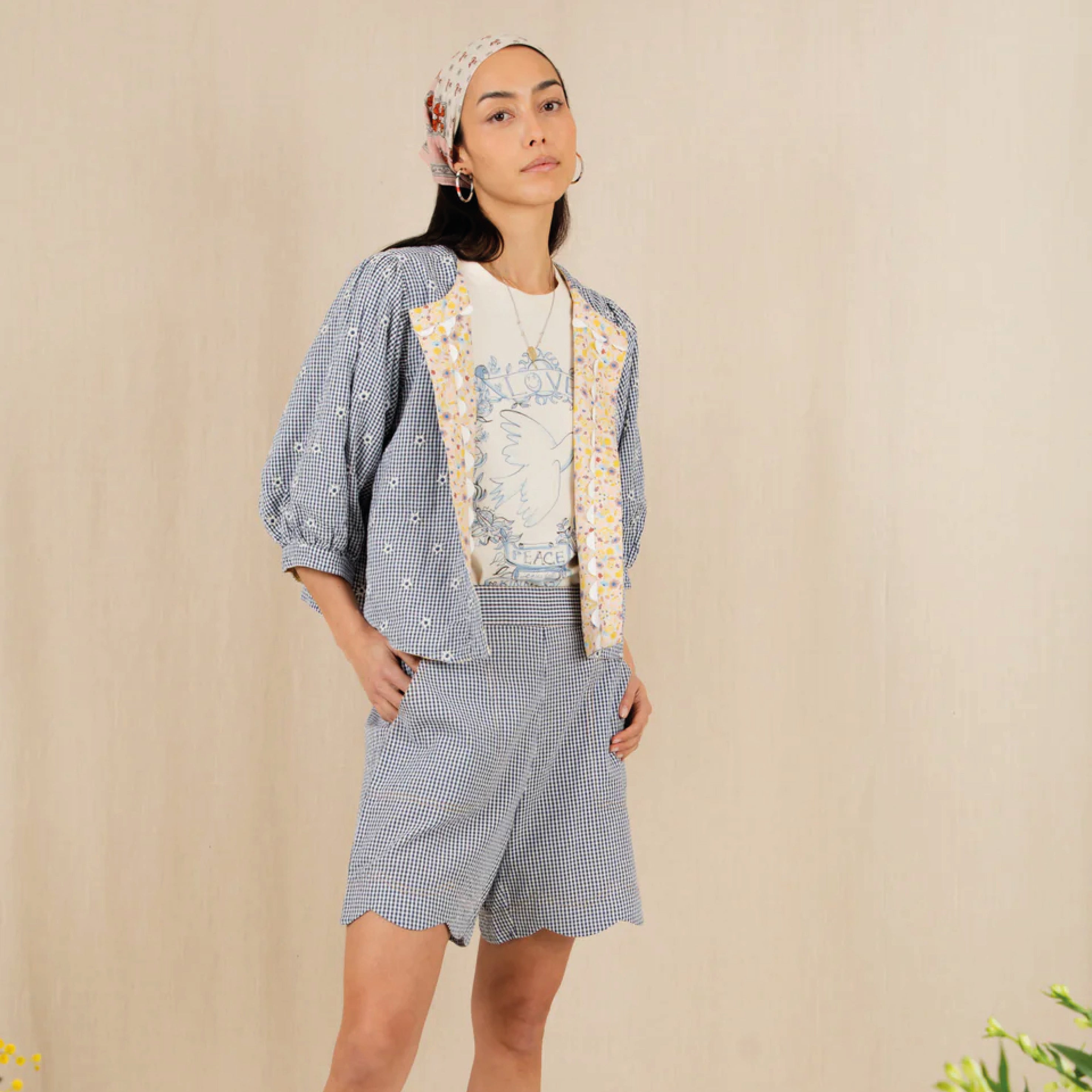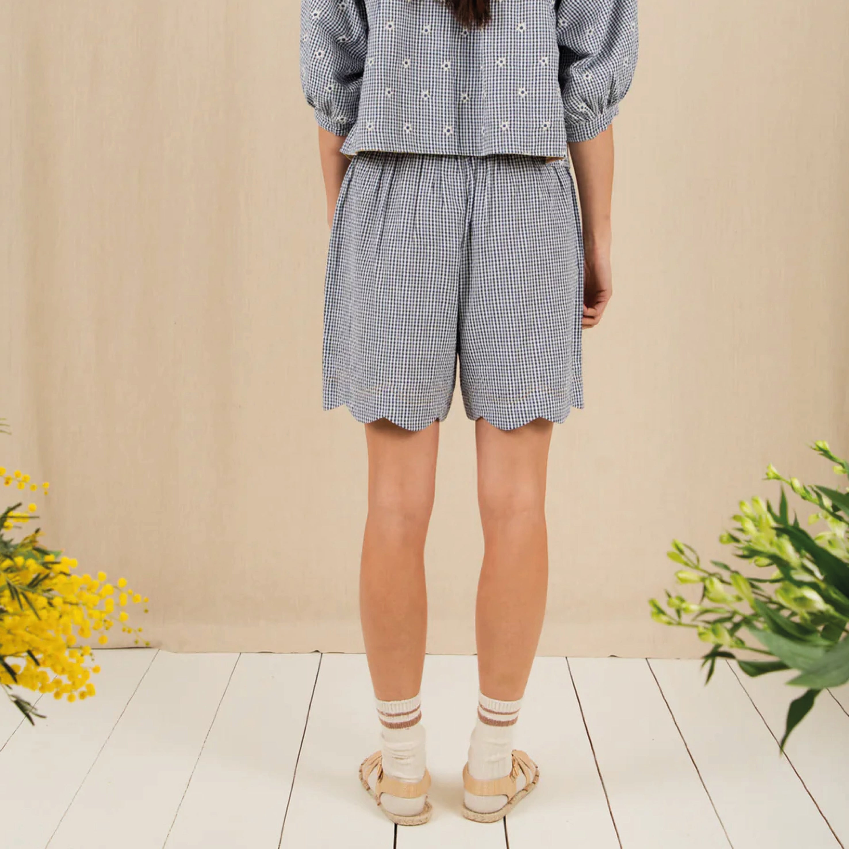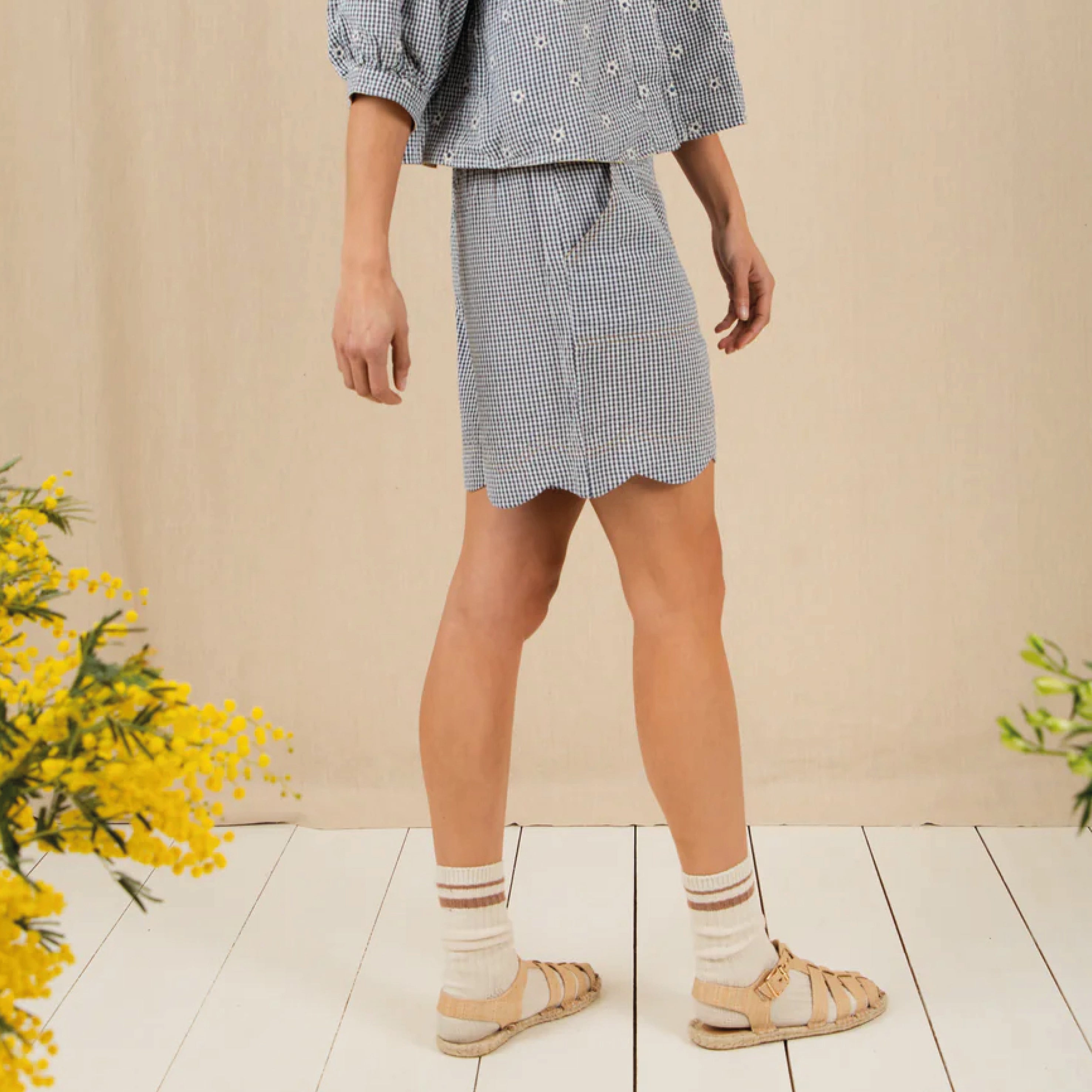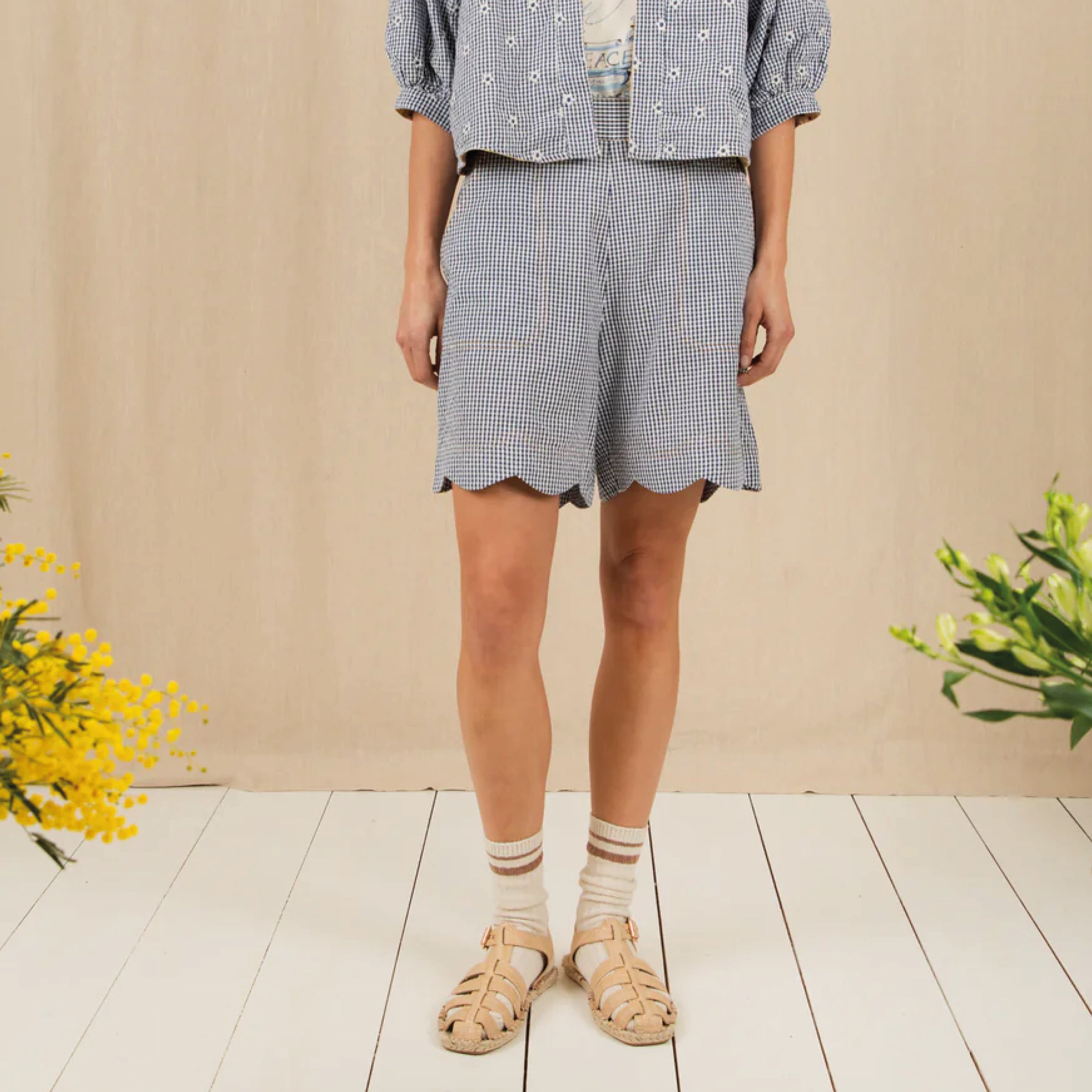 The Bonté Navy Gingham Mary Shorts are a relaxed and easy fitting pull-on short with an elasticated back, in a garment-washed cotton twill, with tan twin-needle detail. There is an individual scallop hem detail with large stitch-through pockets.