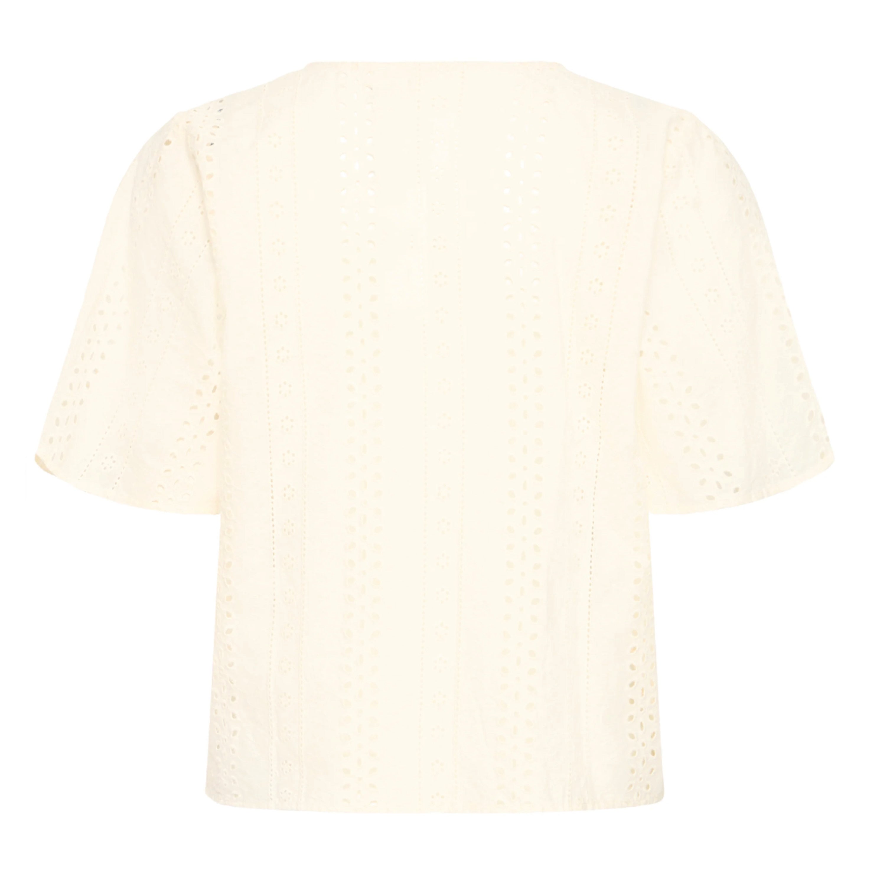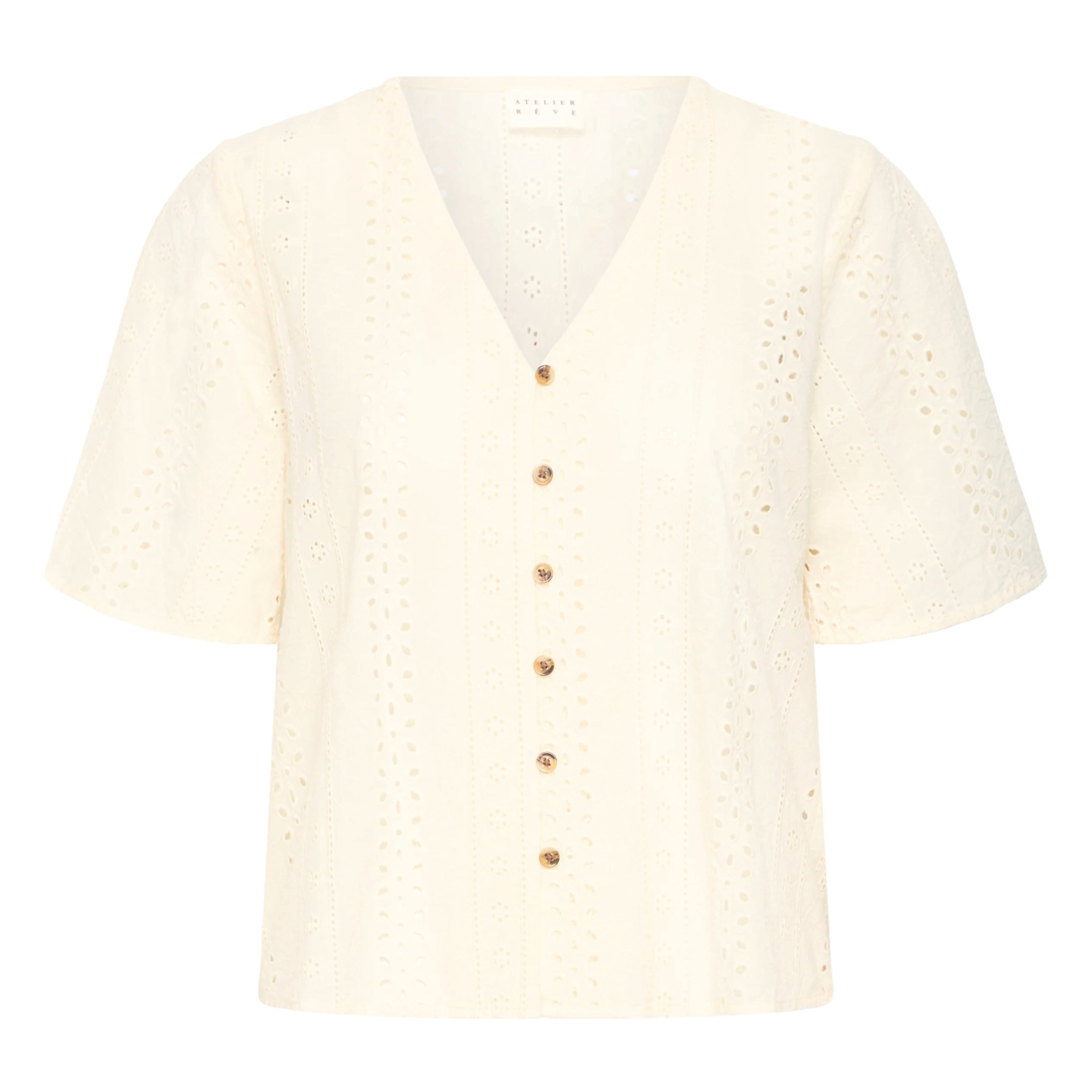 The Atelier Rêve Cao Birch Blouse is a feminine blouse in a light birch shade with delicate lace details. It has a flattering V-neck and button closure at the front for a classic and elegant look. The short sleeves and lightweight cotton quality make the blouse perfect for warm days.