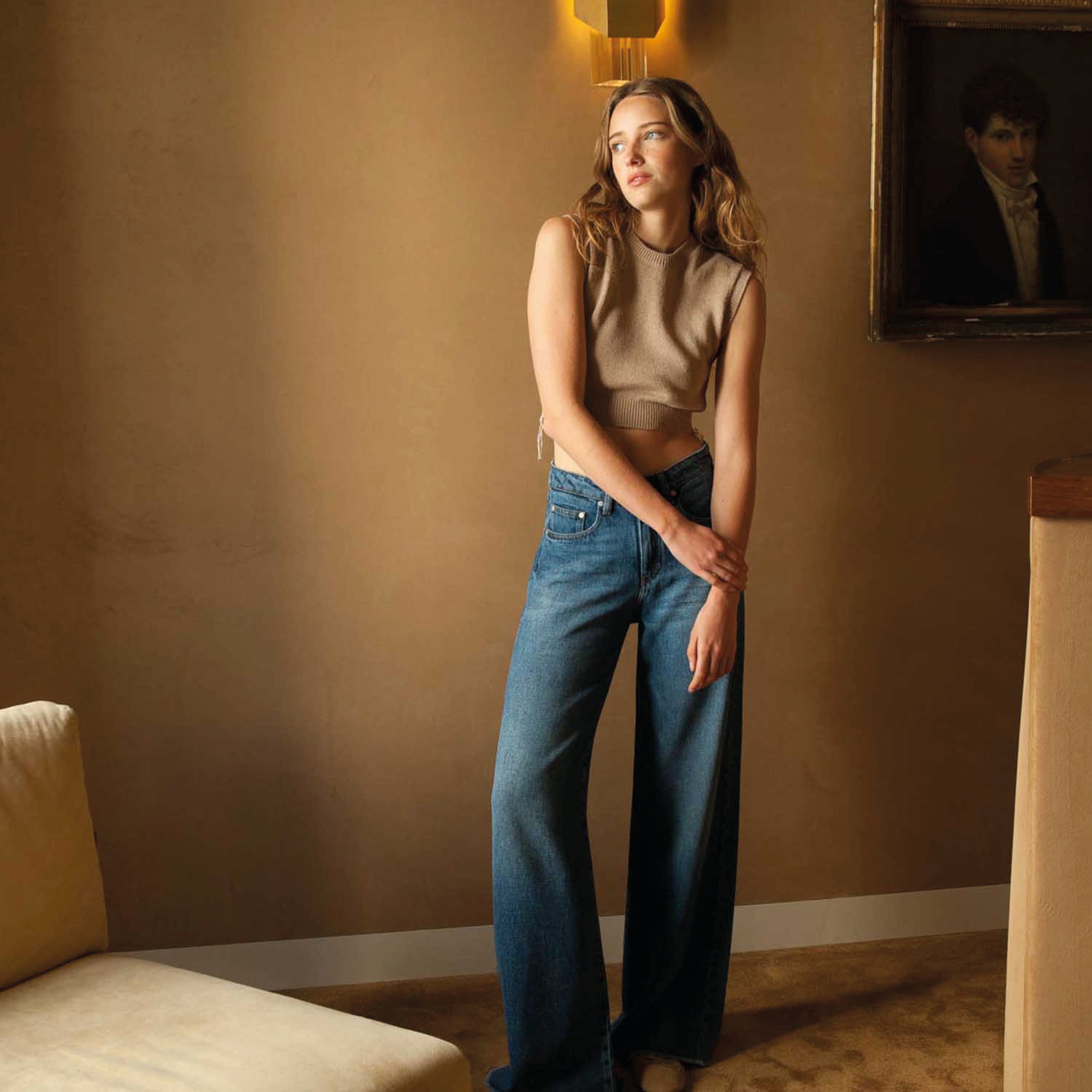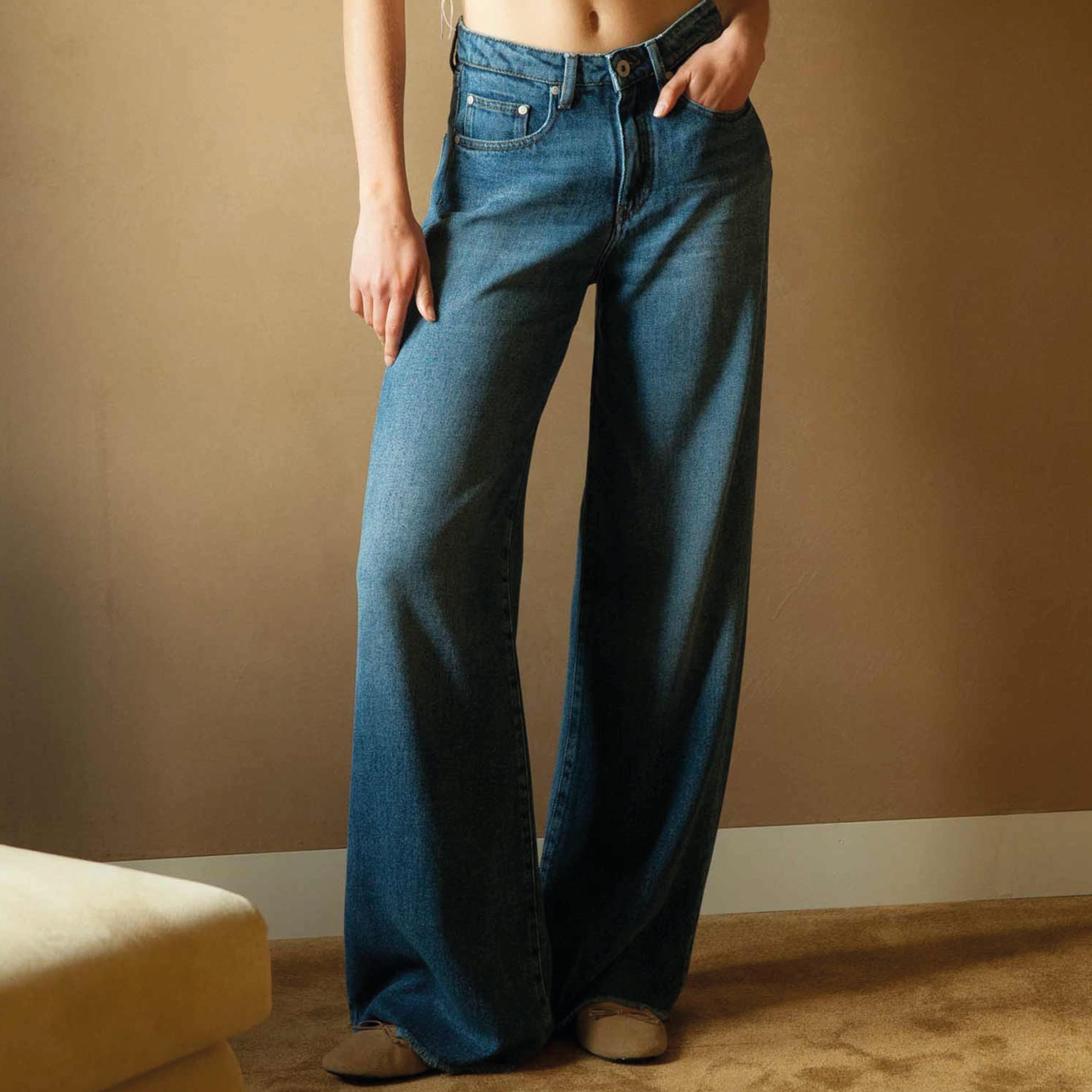 The Denim Studio Jude Denim Tencel Worn Vintage Jeans feature a wide leg in a worn vintage blue wash. The tencel lyocell fabric is softer and less rigid than traditional cotton denim for a comfortable fit.
