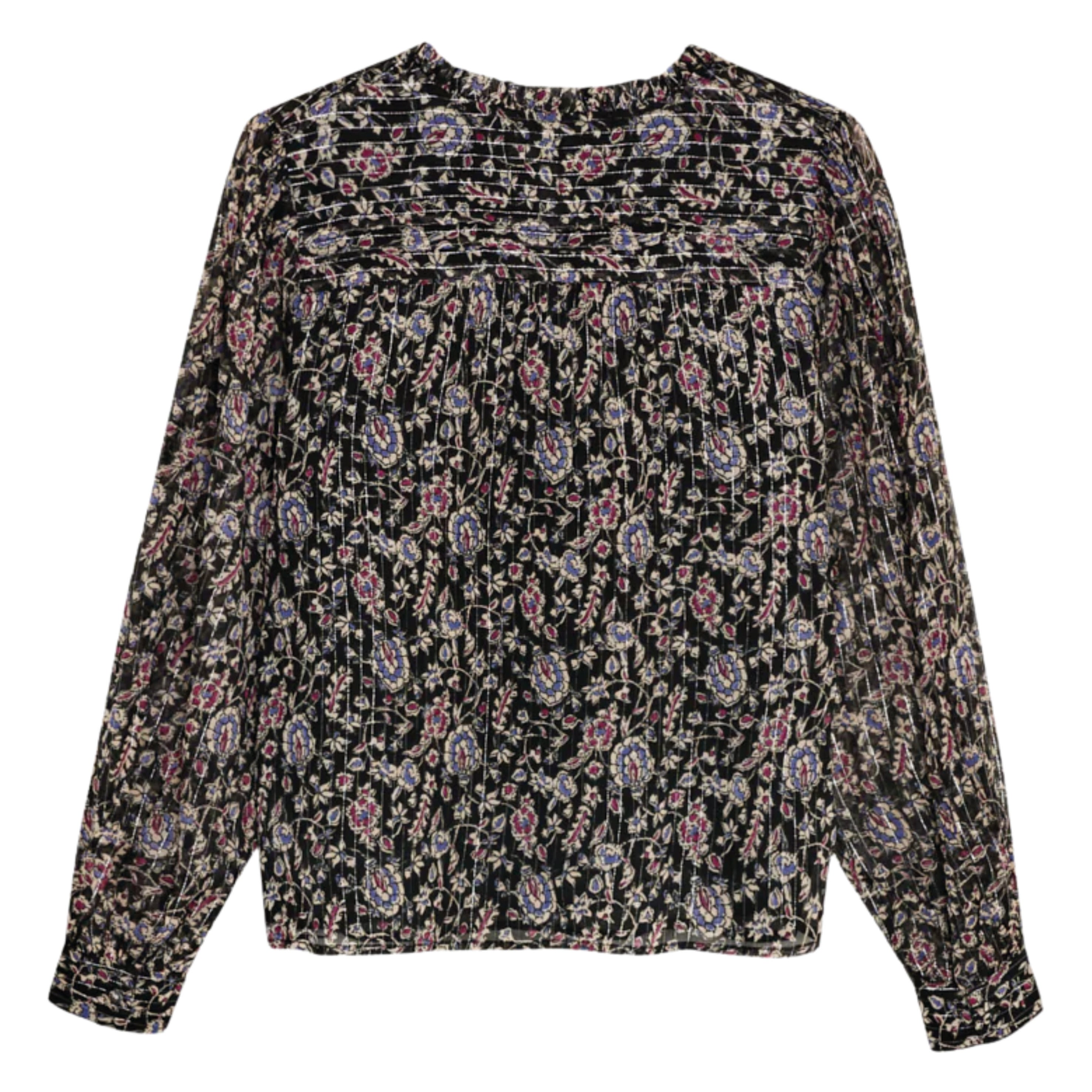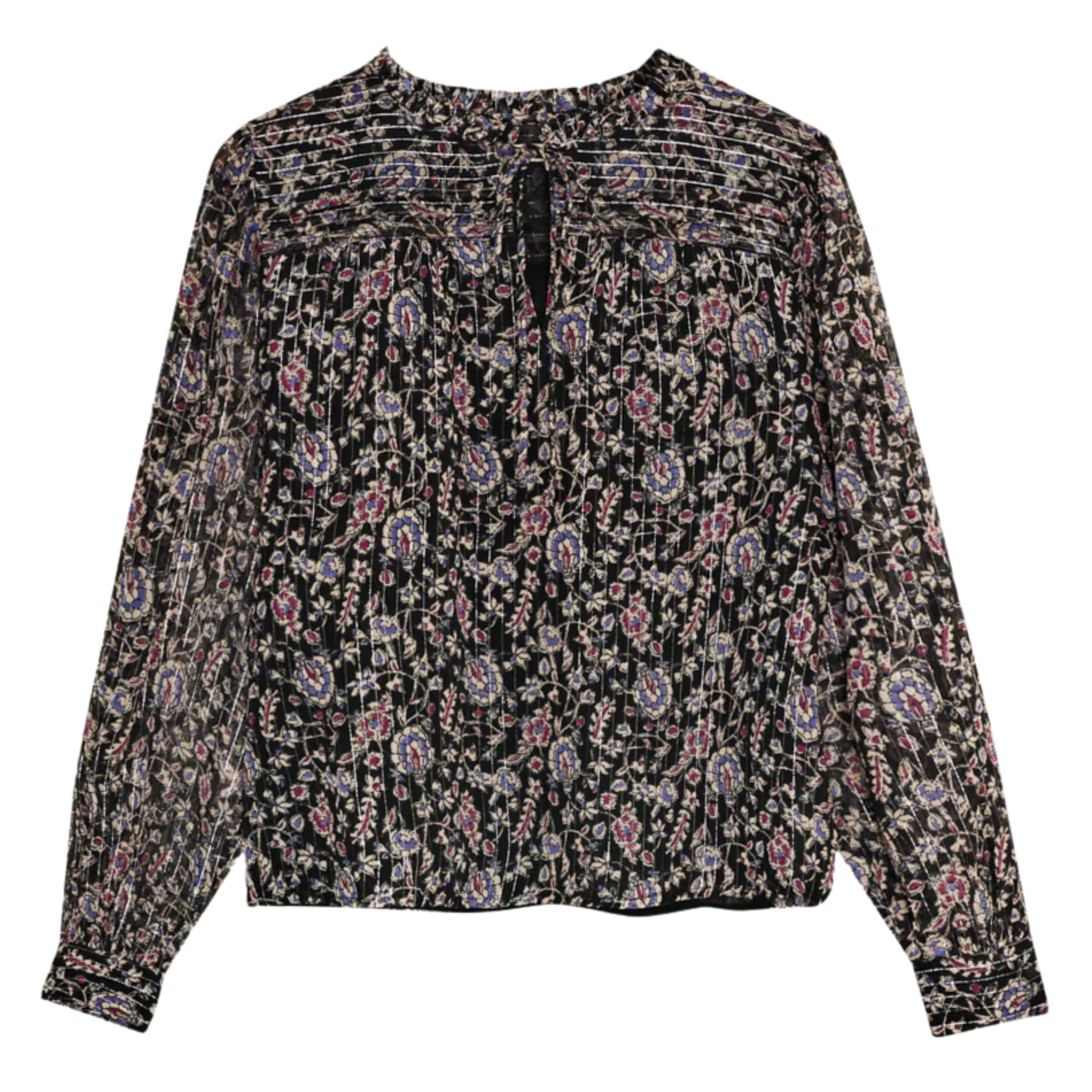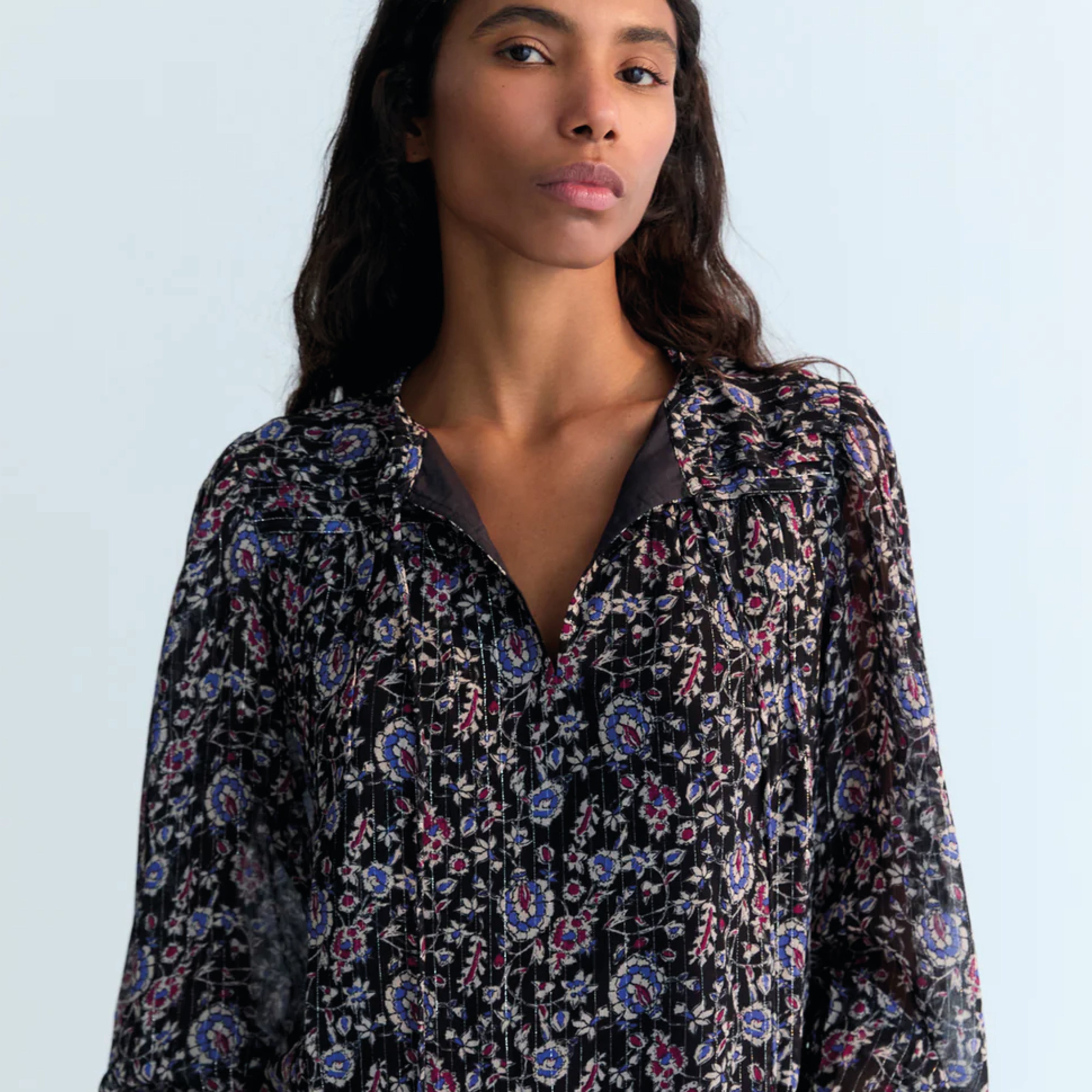 The Francisca Blouse is a statement piece with refined detail. Crafted in soft viscose with a touch of lurex, this blouse shimmers subtly while showcasing a beautiful all-over print. The front keyhole opening with a delicate tie closure adds femininity, while hand-pleated detailing highlights its artisanal finish. Effortless yet elegant, it transitions seamlessly from day to evening.
