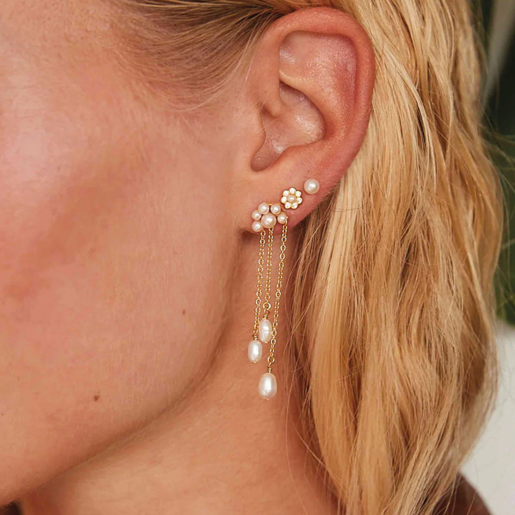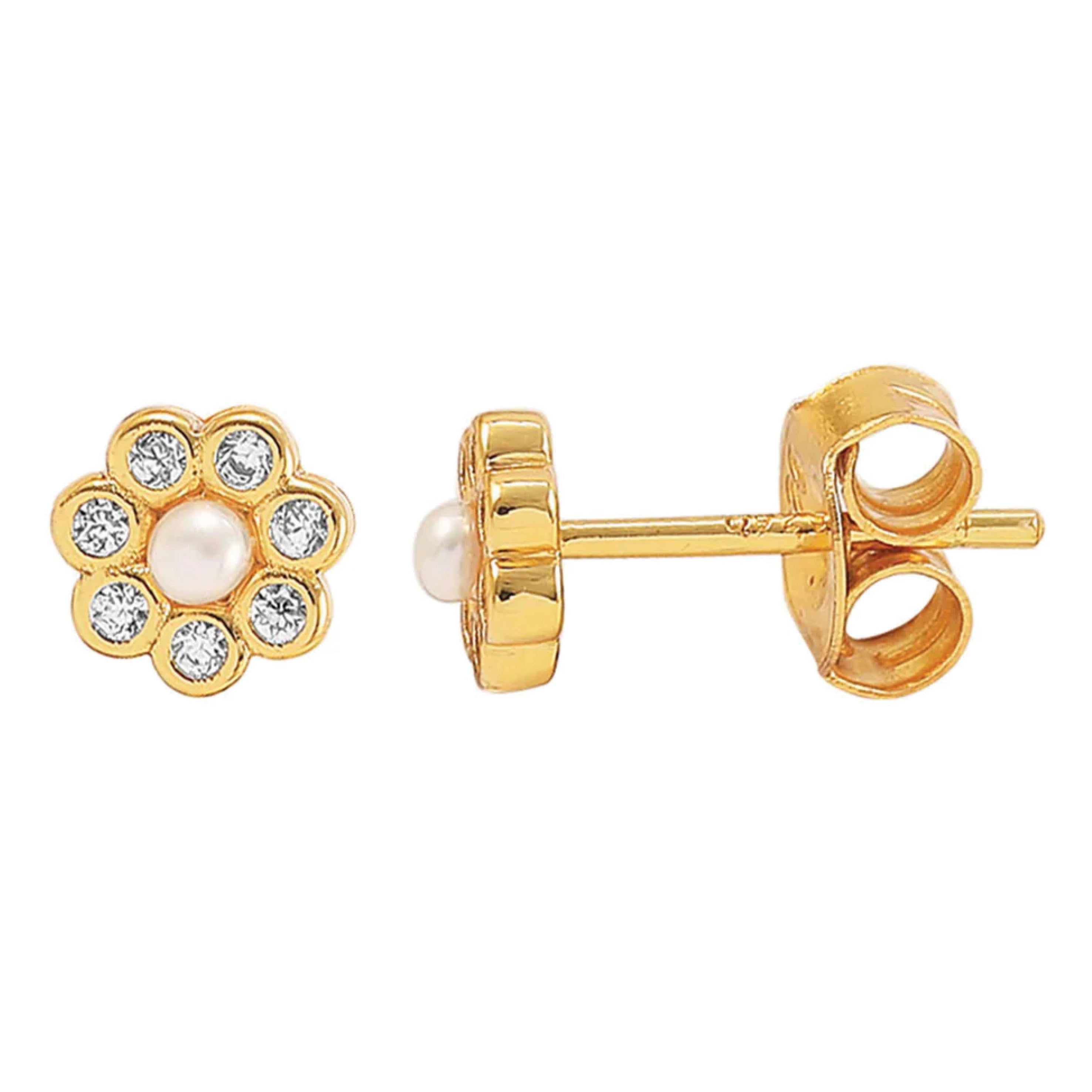 The Hultquist Copenhagen Aya Flower Stud Earrings are crafted from 18K gold plated 925 sterling silver, cubic zirconia and freshwater pearl.