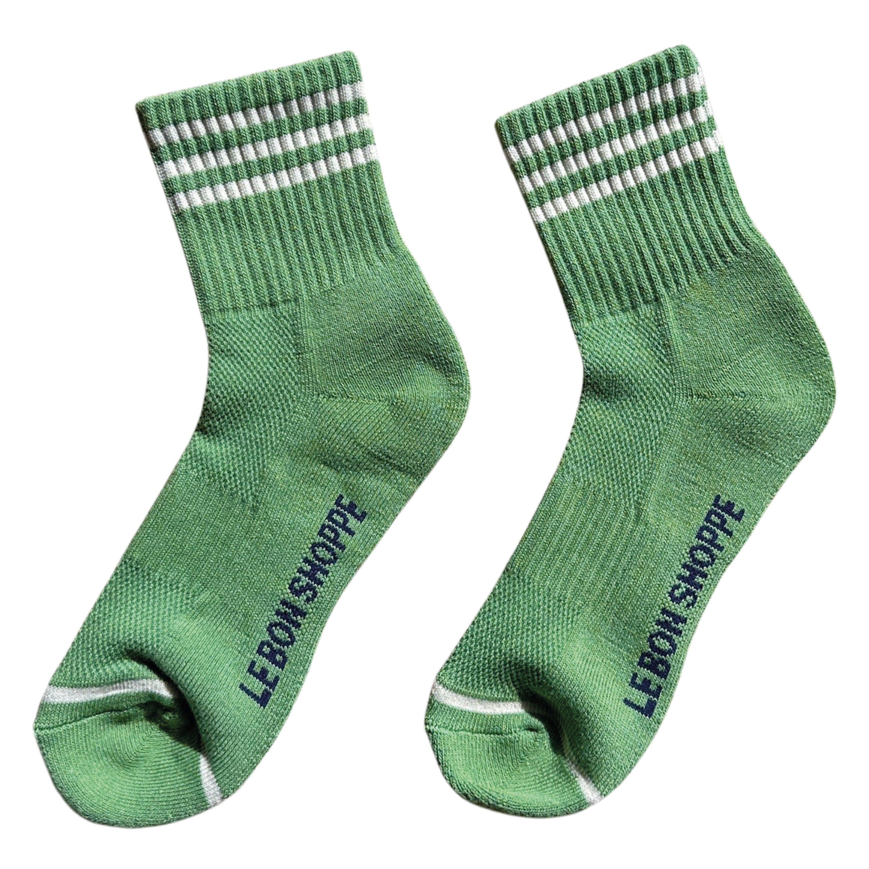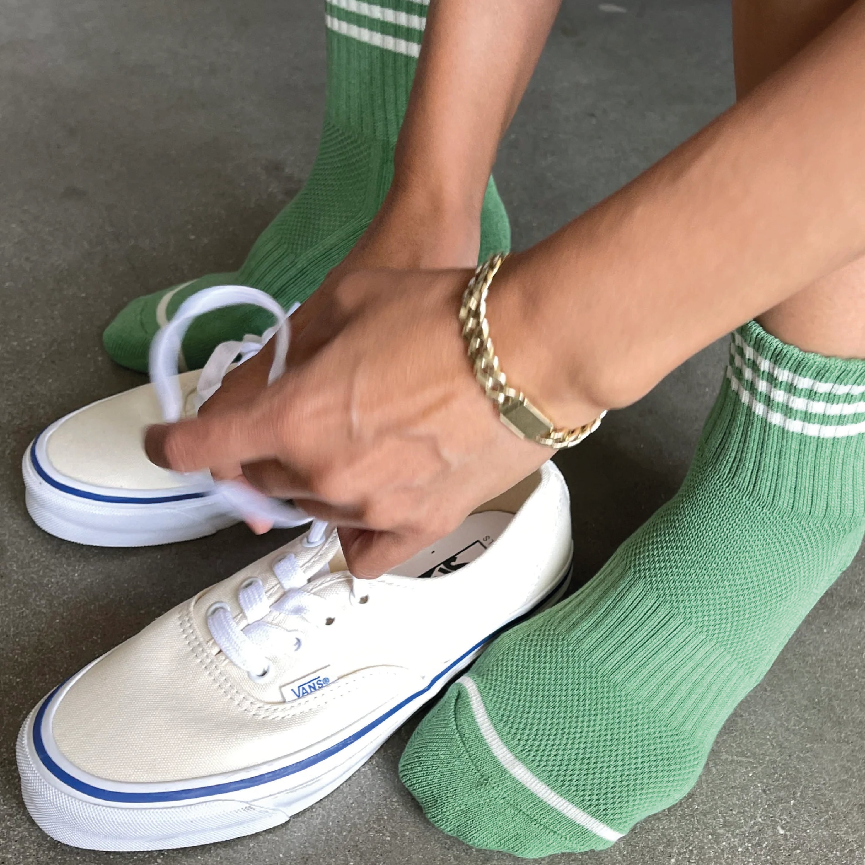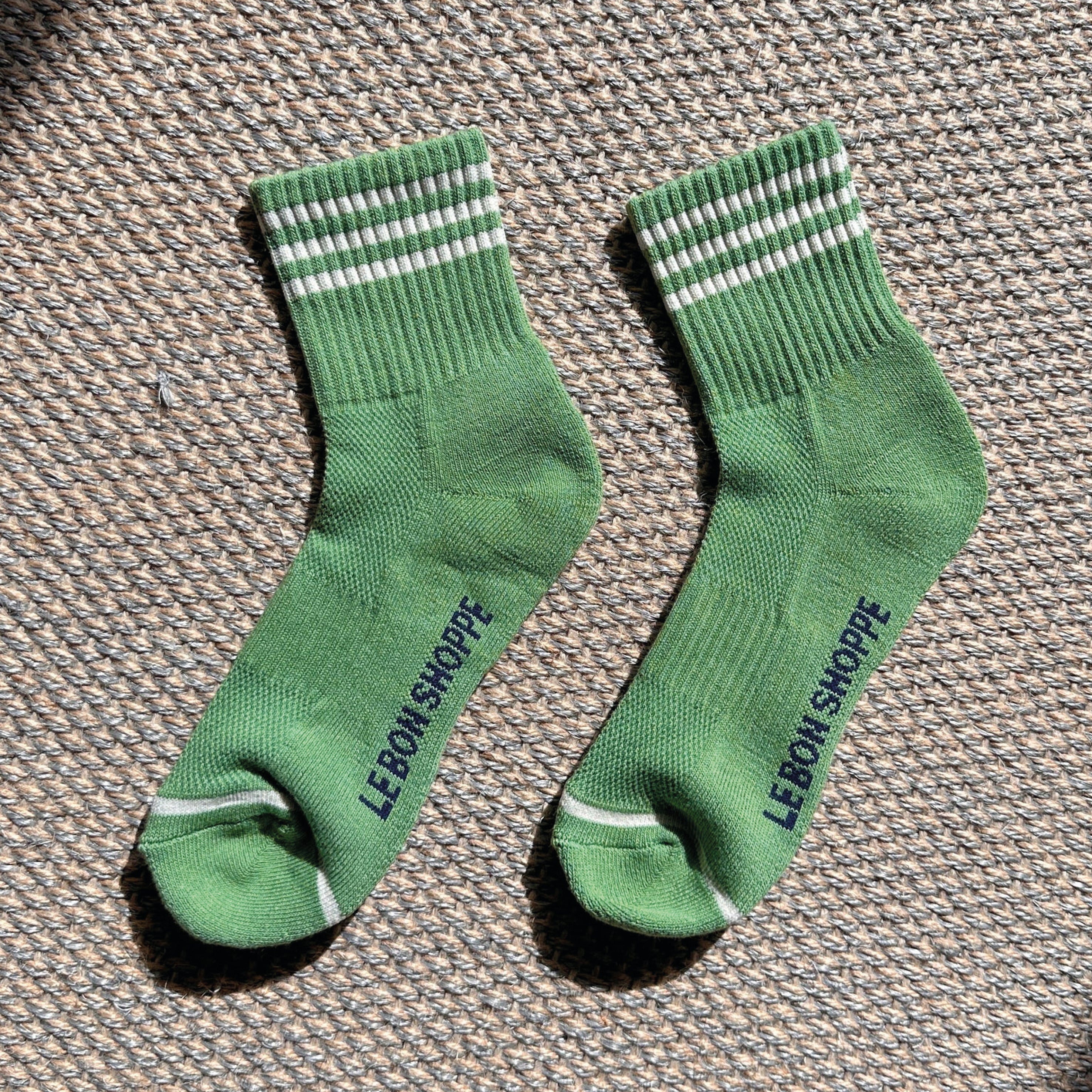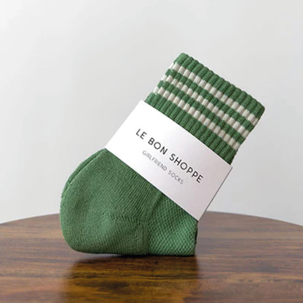 The Le Bon Shoppe Avocado Girlfriend Socks feature a triple contrast stripe at the opening and a shorter classic crew sock length. A universally quintessential sock.