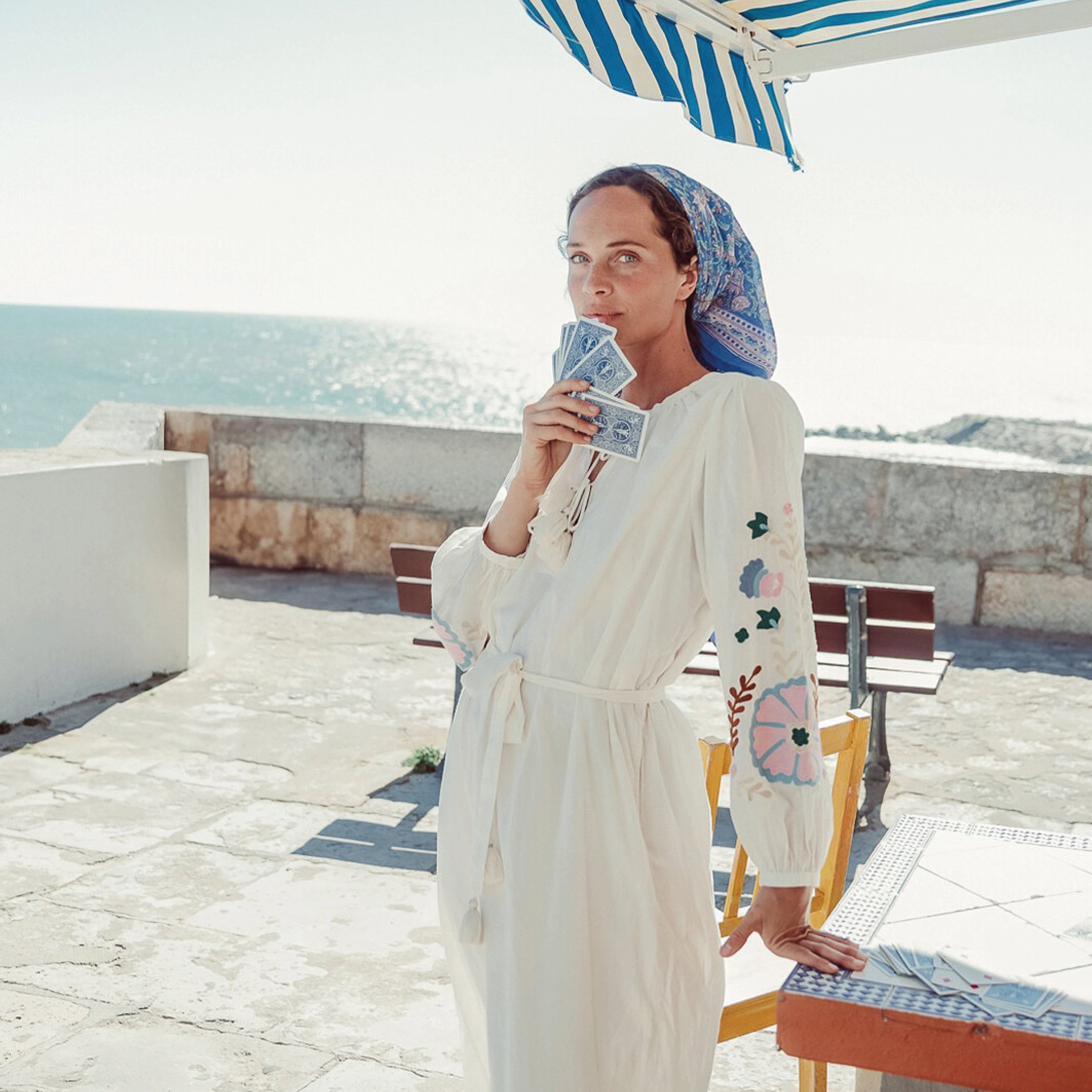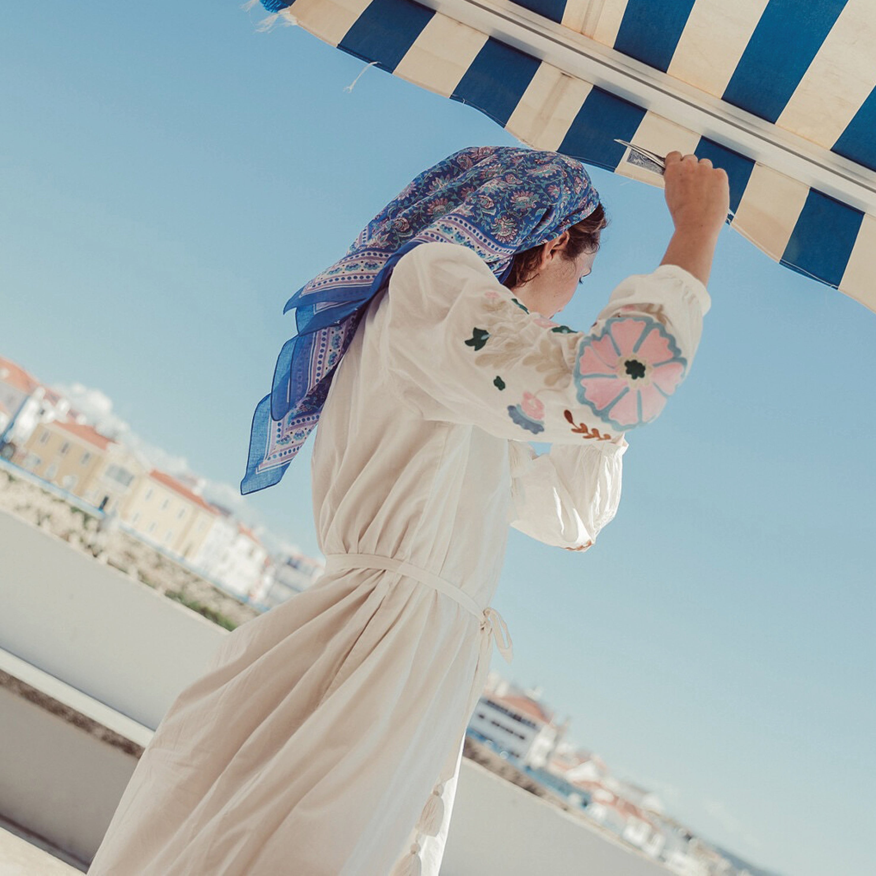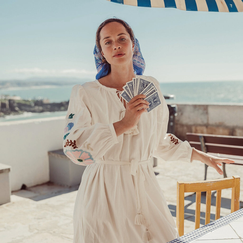 The Louise Misha Off White Martina Dress is a real standout, with a deep V-neckline with drawstrings and handmade pompoms and lurex thread to tie at two levels. We love the long sleeves with large textured embroideries and buttoned cuffs.