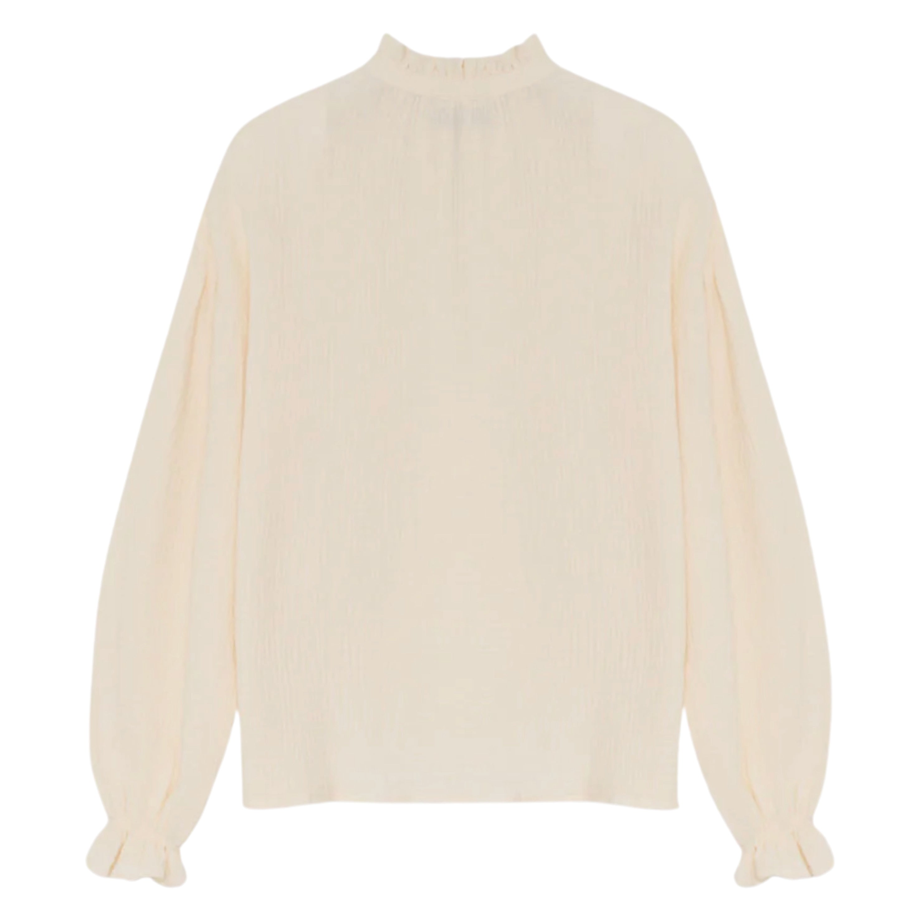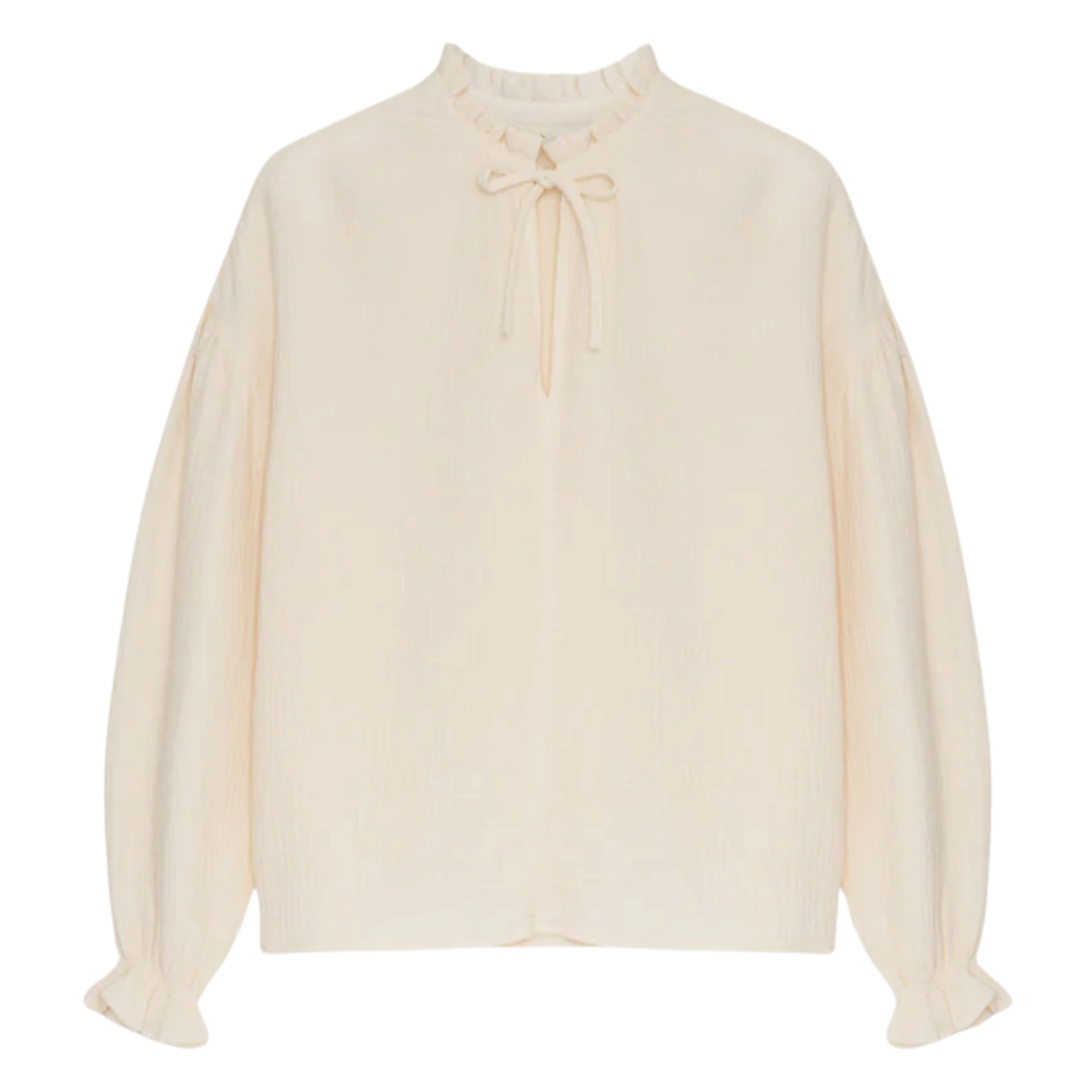 The classic Moonlight White Olivia Blouse is crafted from soft and breathable double gauze fabric, is a timeless wardrobe staple. Designed with puffed sleeves and a front keyhole detail with a delicate tie closure, it adds a charming touch to any look.
