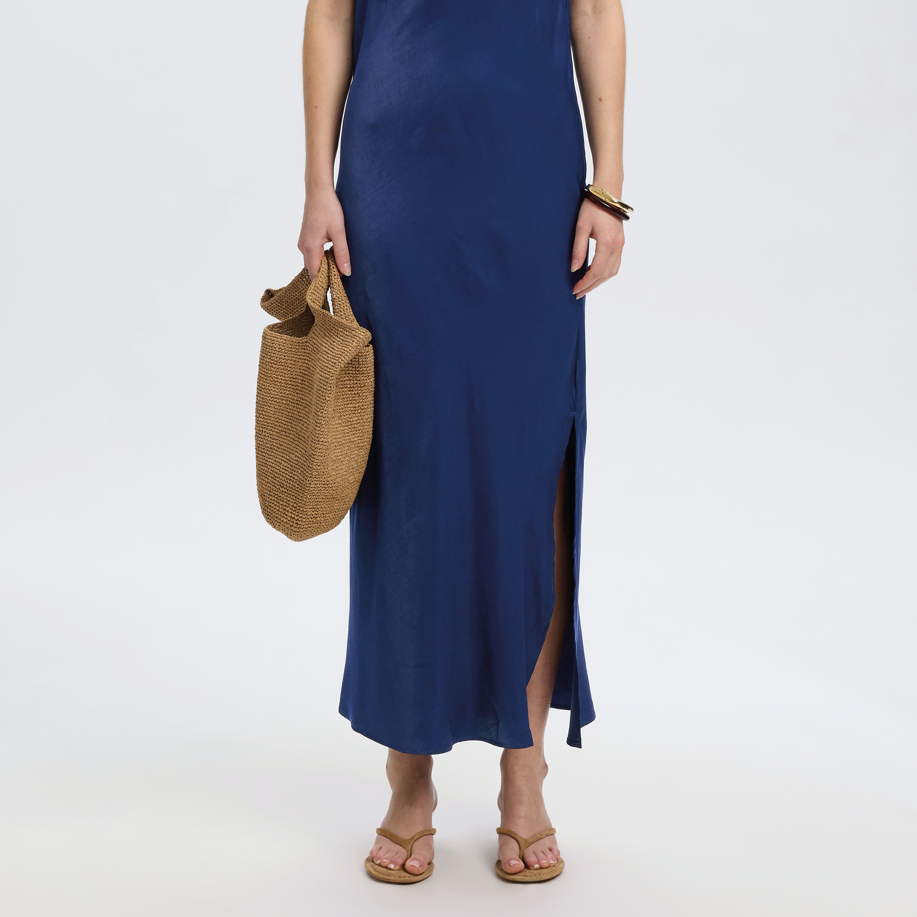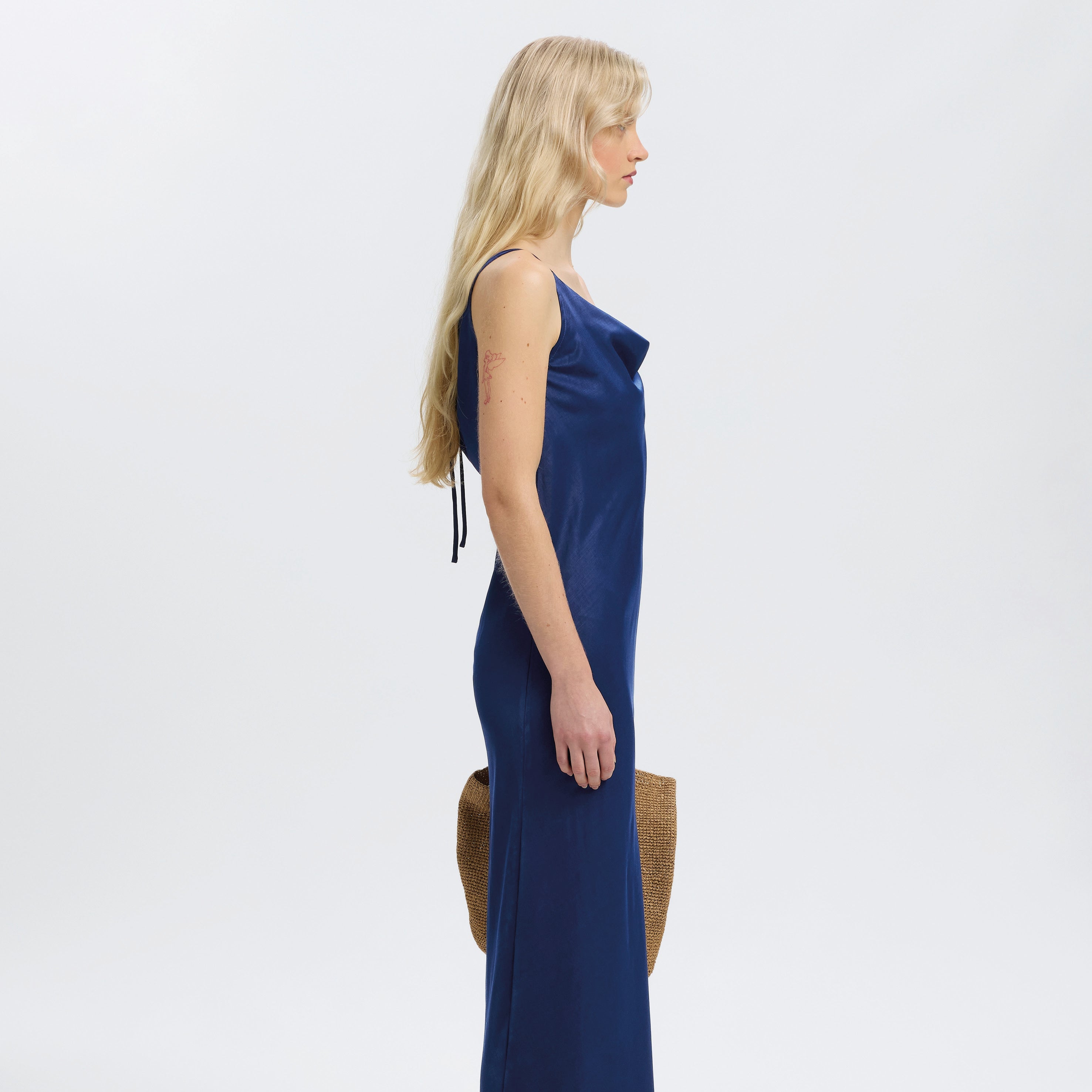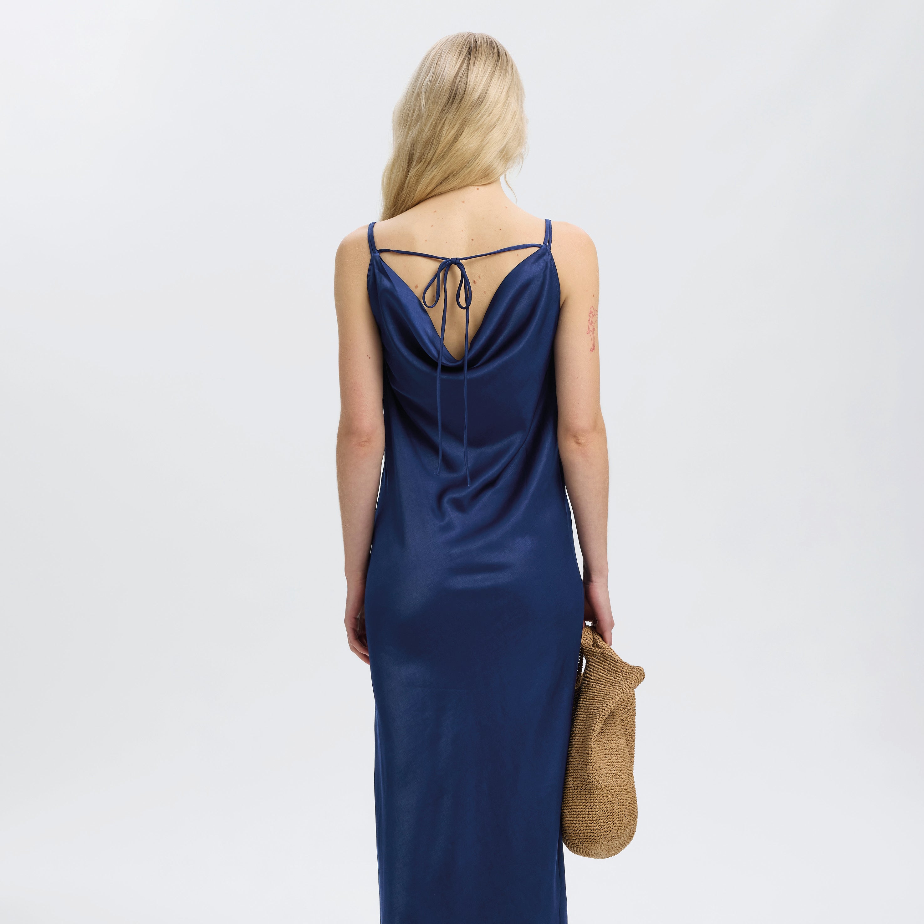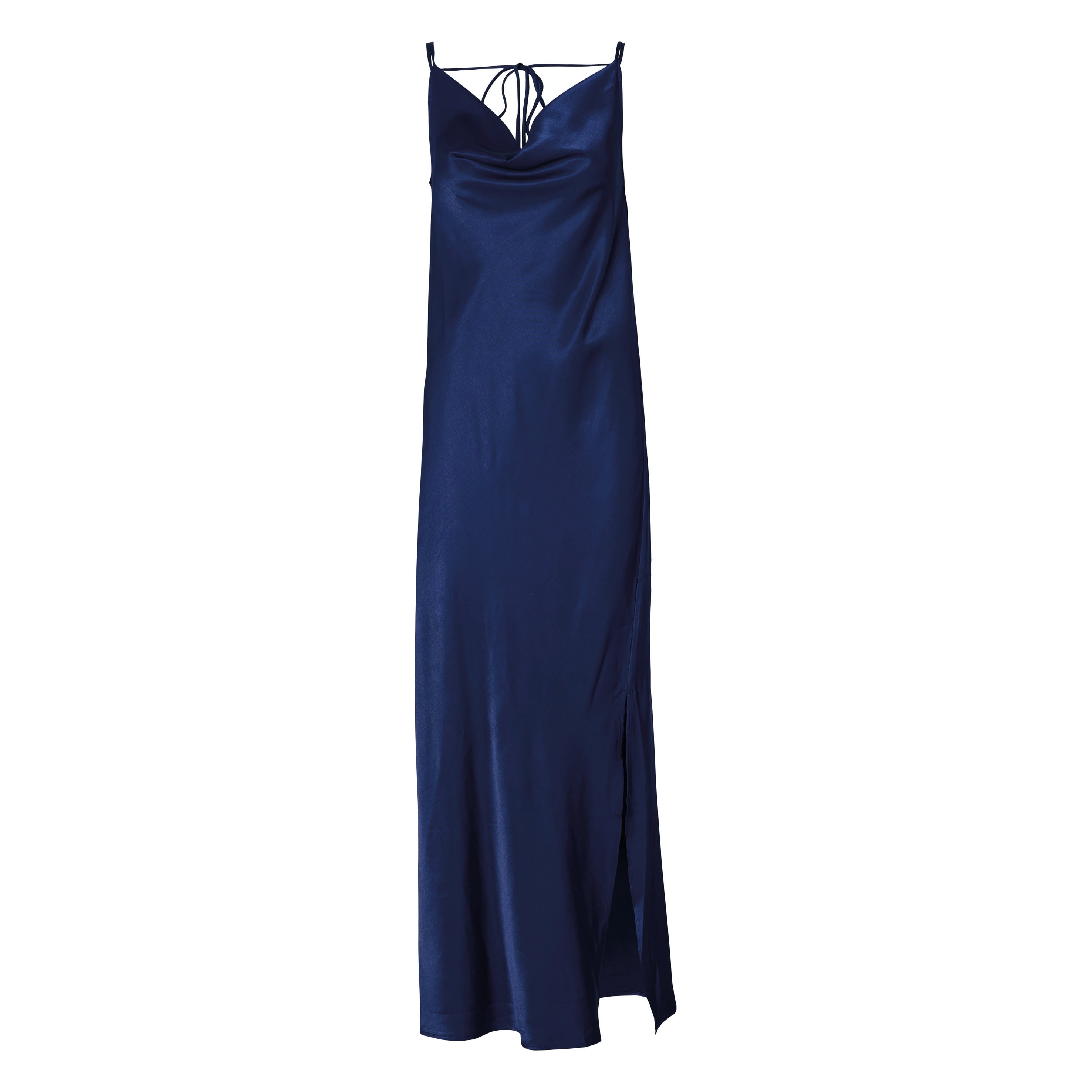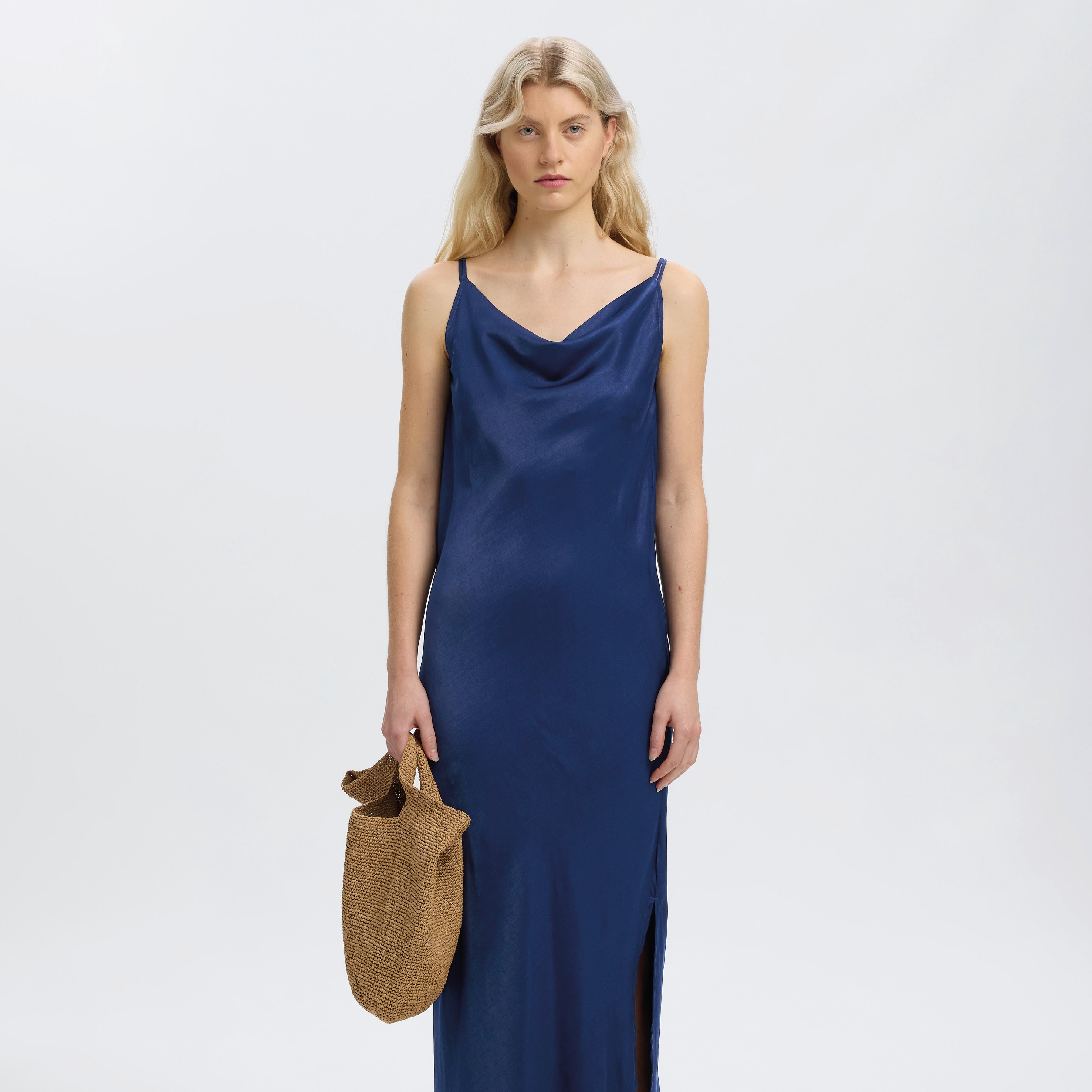 Dress up for the occasion with this Selected Femme Ocean Cavern Giona Dress with scoop neck and flattering waterfall effect. This maxi satin cami dress shines on its own, so we love to simply pair it with kitten heels and some gold jewellery.