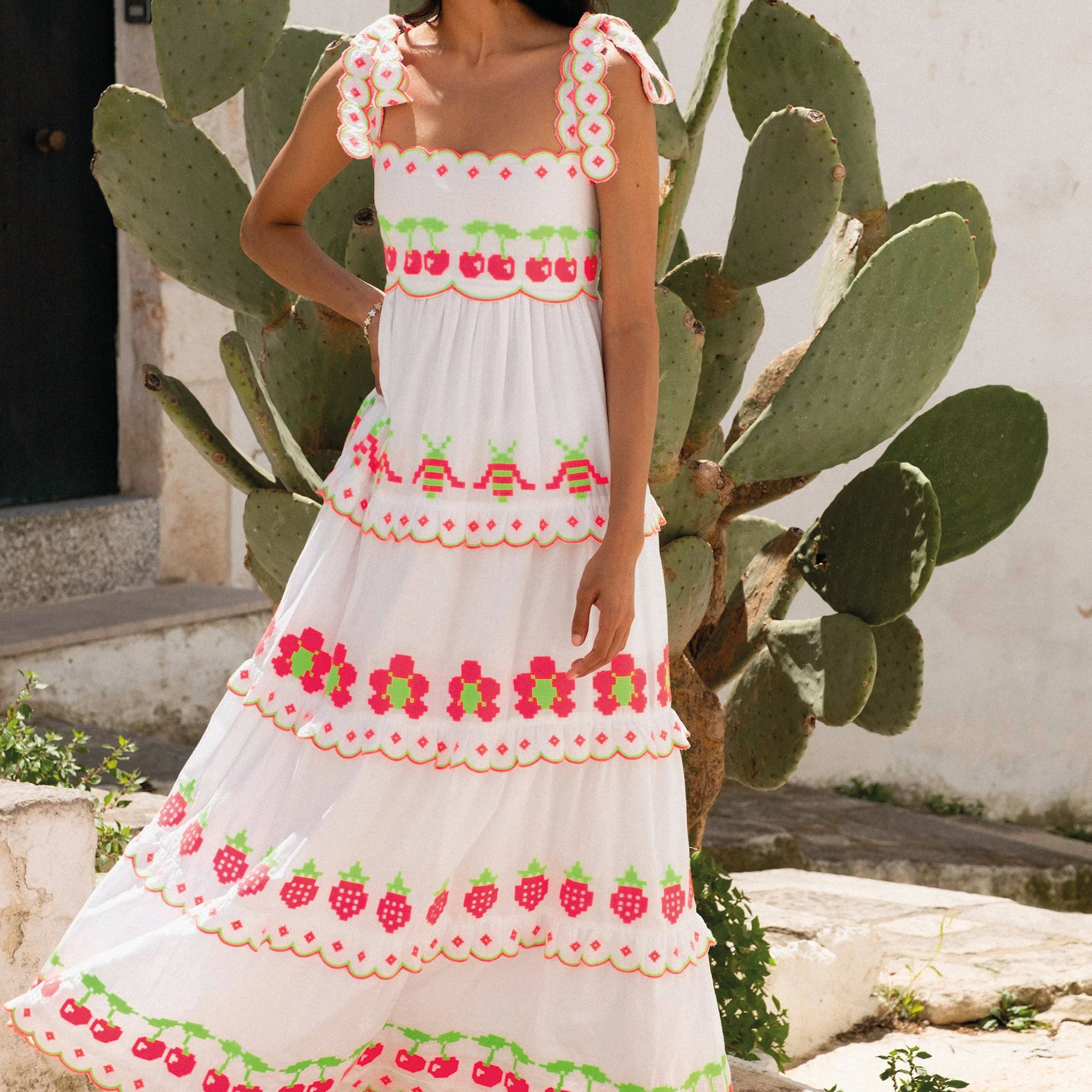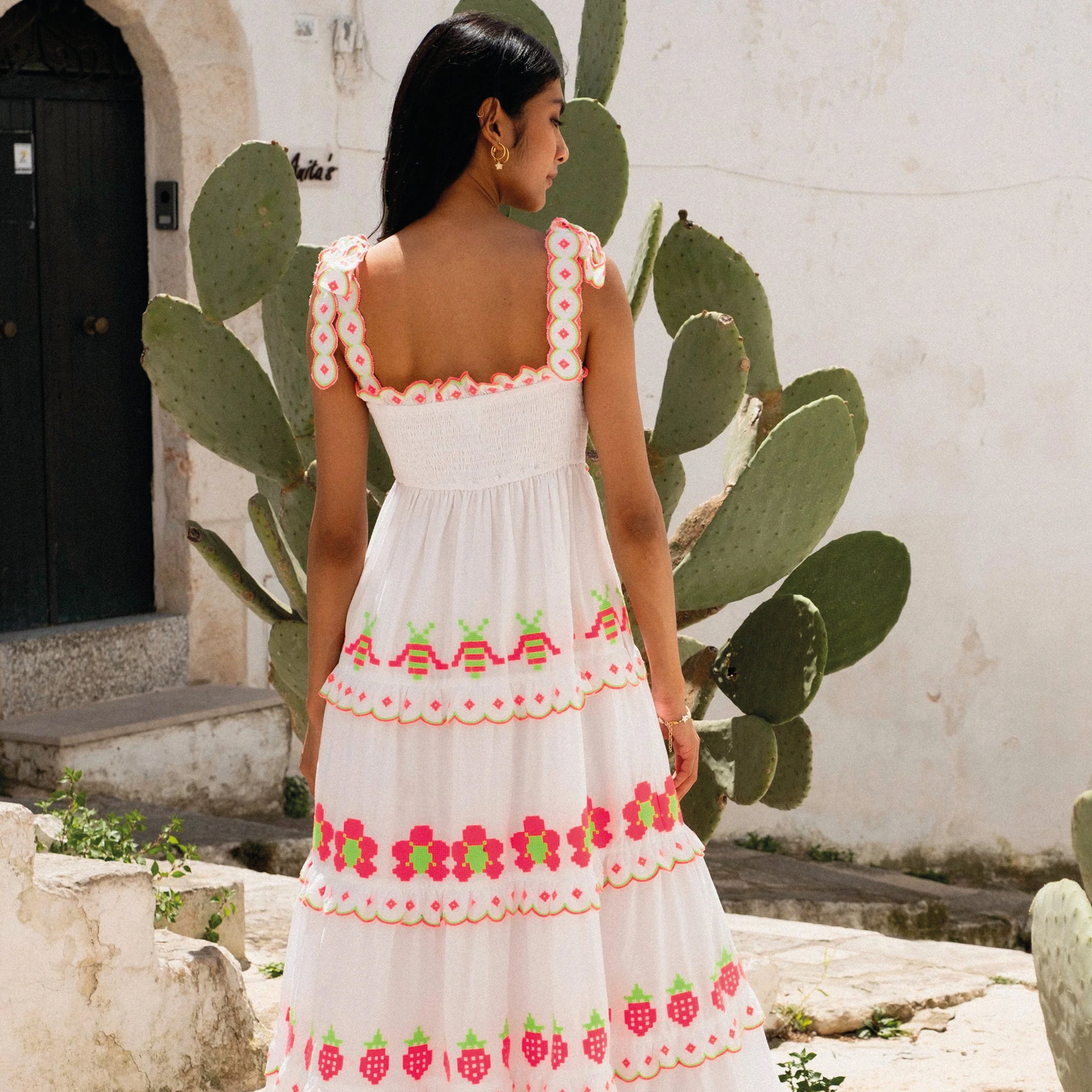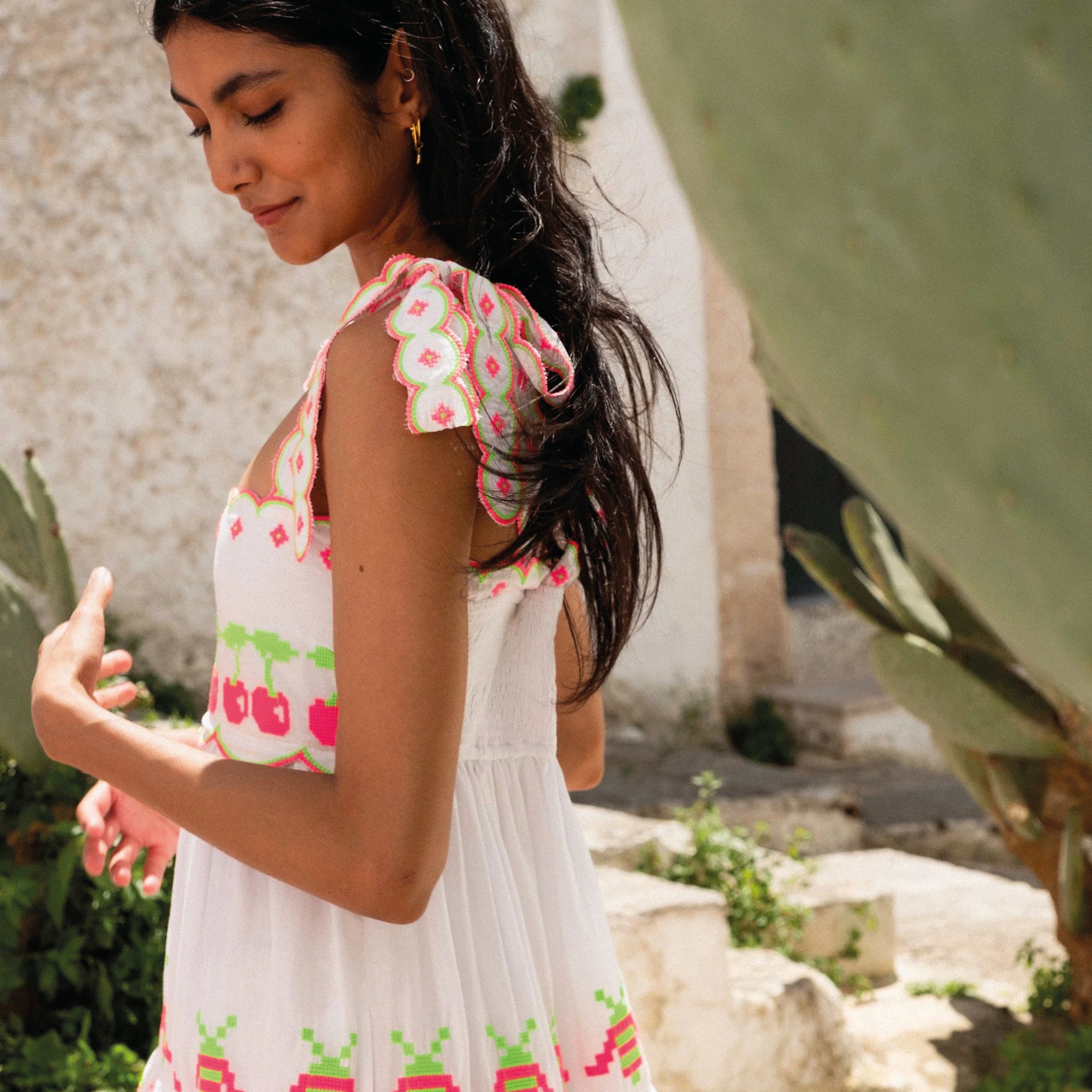 Make a statement in the Pink City Prints Neon Fruit Embroidered Athens Dress, bursting with bold neon pinks and greens. Set against a crisp white organic cotton base, featuring embroidered strawberries, cherries, bees, and flowers that capture the essence of summer. Scalloped tie straps and a tiered midi skirt add playful movement, while a smocked back ensures a comfortable fit. Perfect for sun-soaked days and balmy nights.