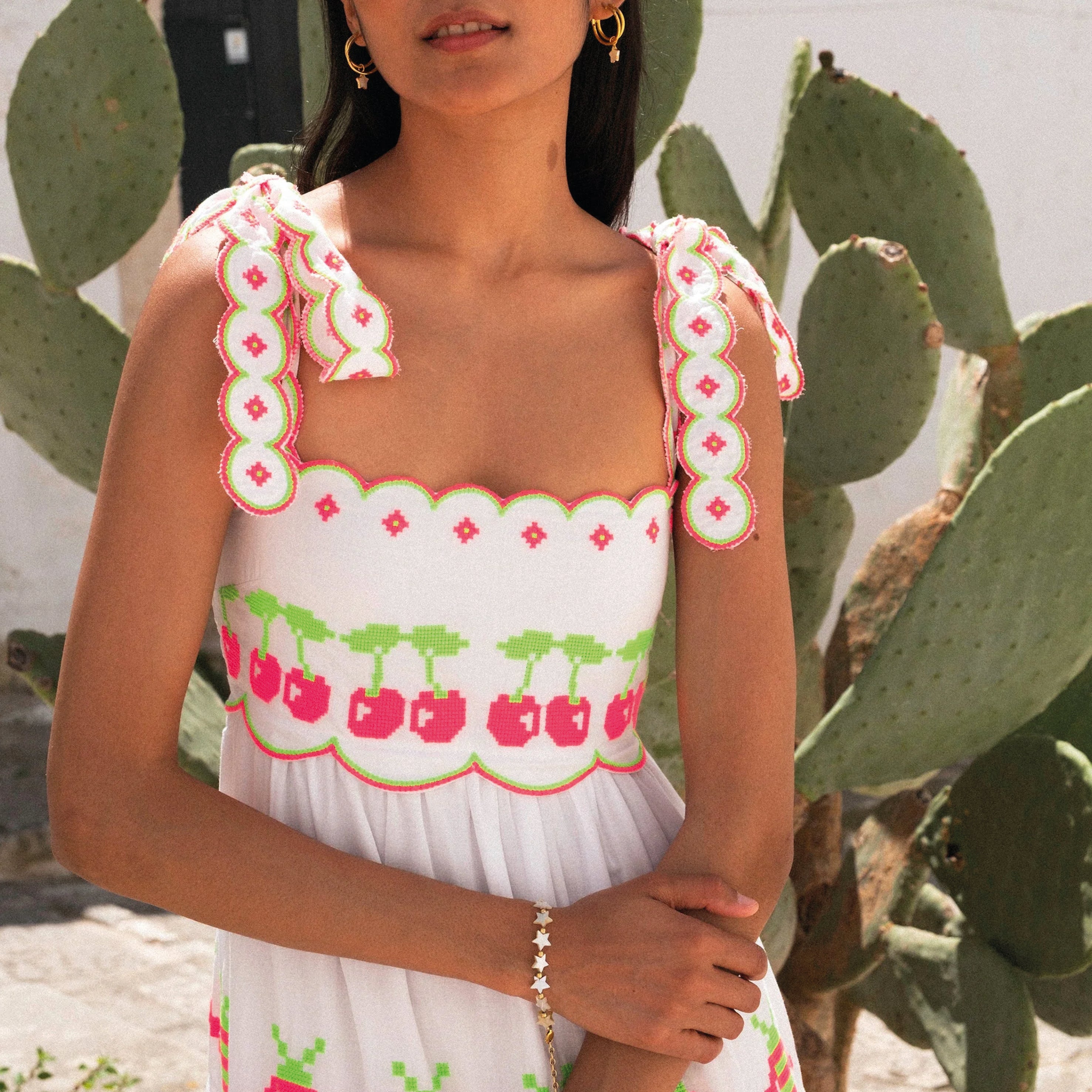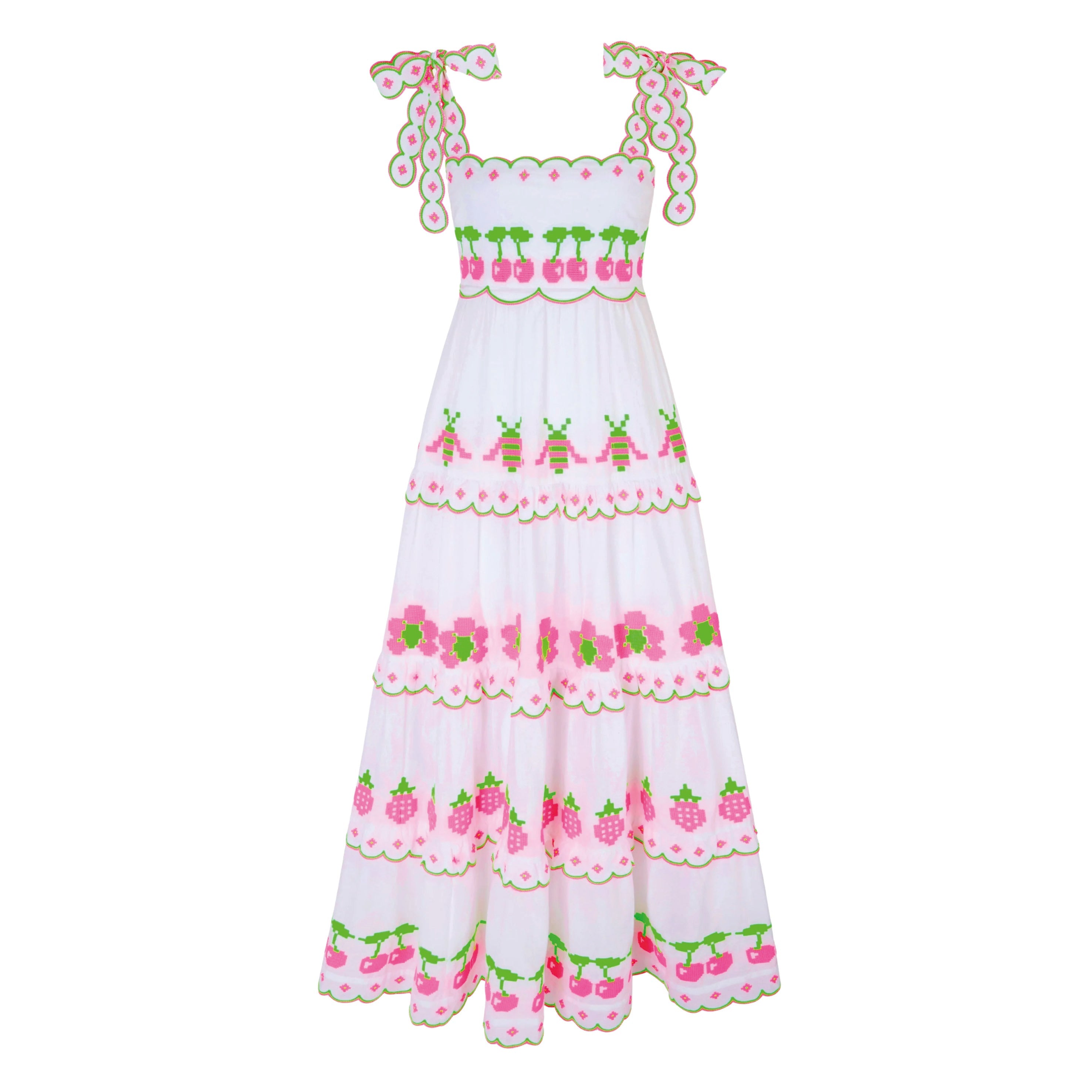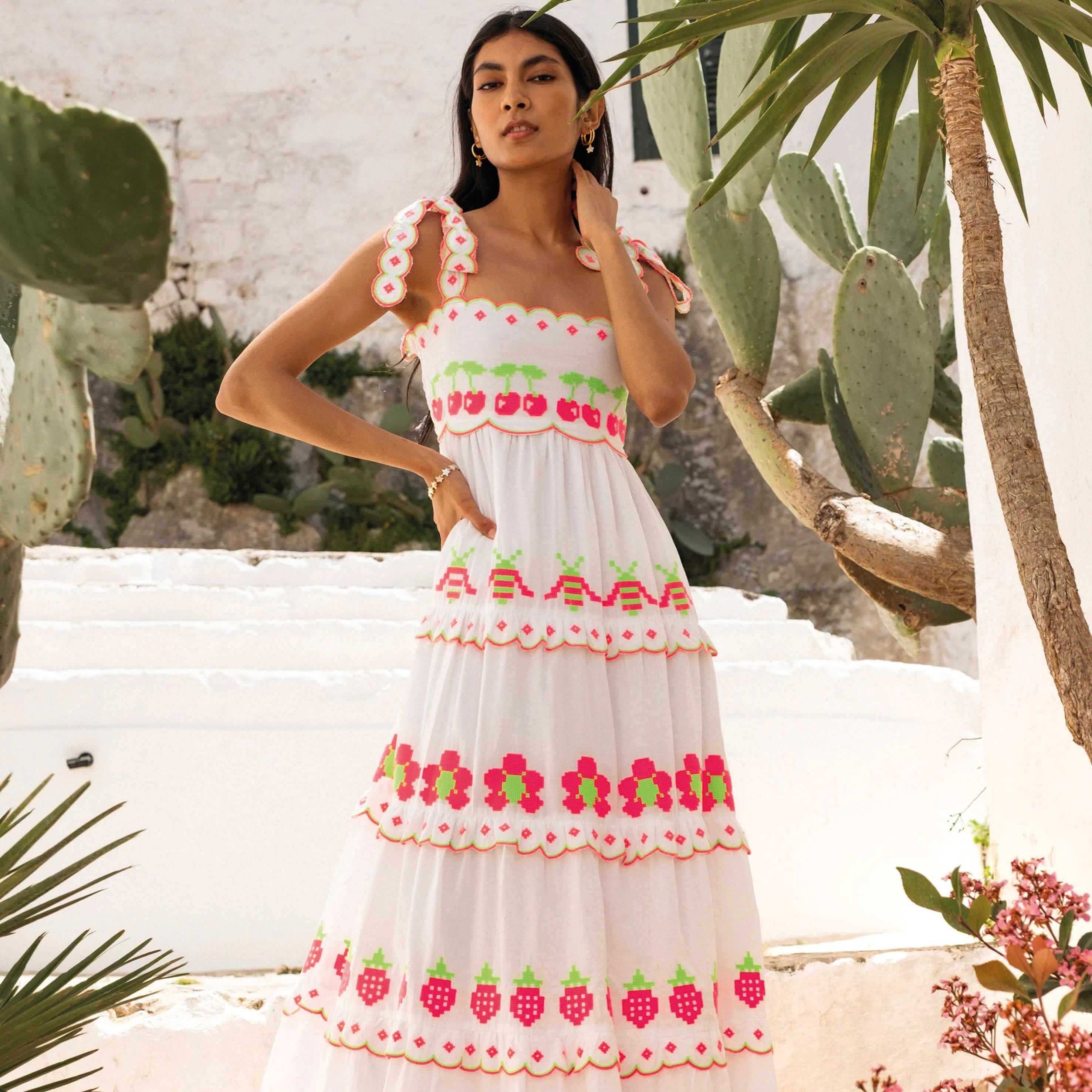 Make a statement in the Pink City Prints Neon Fruit Embroidered Athens Dress, bursting with bold neon pinks and greens. Set against a crisp white organic cotton base, featuring embroidered strawberries, cherries, bees, and flowers that capture the essence of summer. Scalloped tie straps and a tiered midi skirt add playful movement, while a smocked back ensures a comfortable fit. Perfect for sun-soaked days and balmy nights.