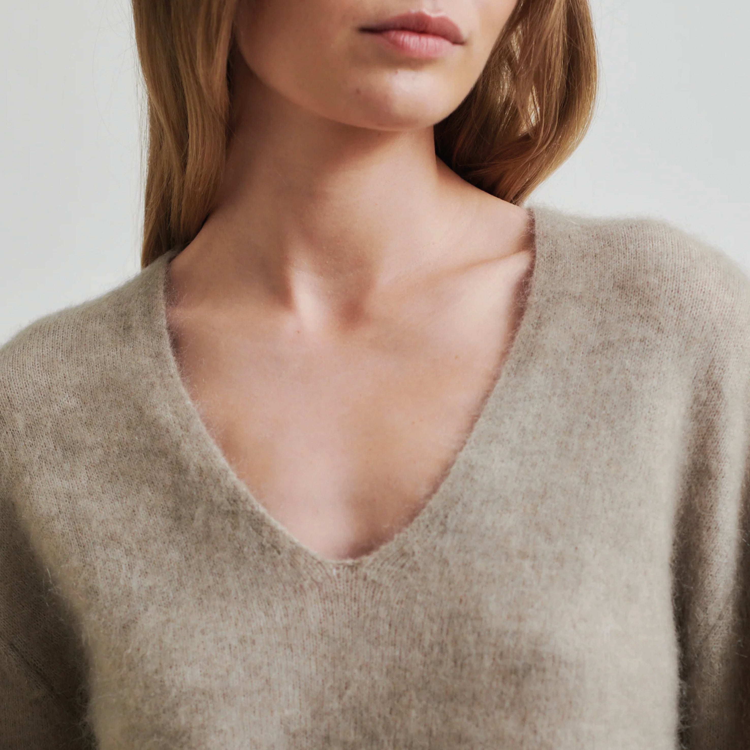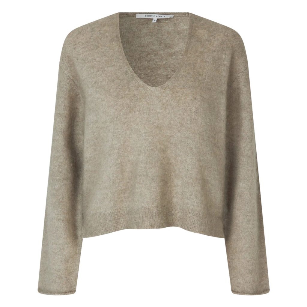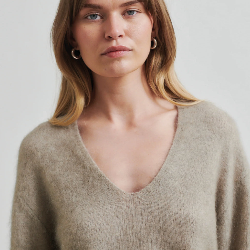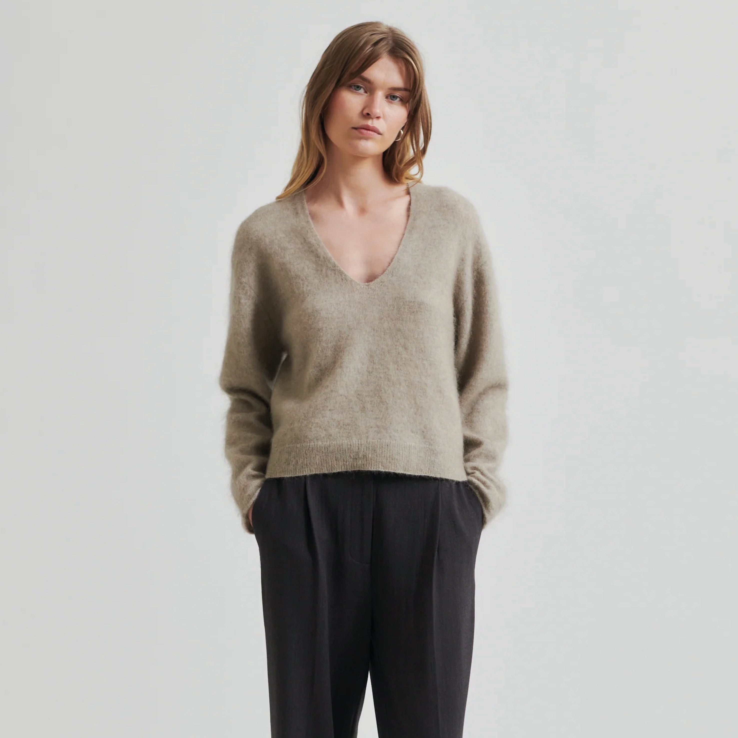 The Second Female Trench Coat Camryn Knit is a luxurious V-neck pullover made in a soft and stretchy mohair blend with a fluffy quality. Featuring a V-neckline and dropped shoulders with long sleeves.