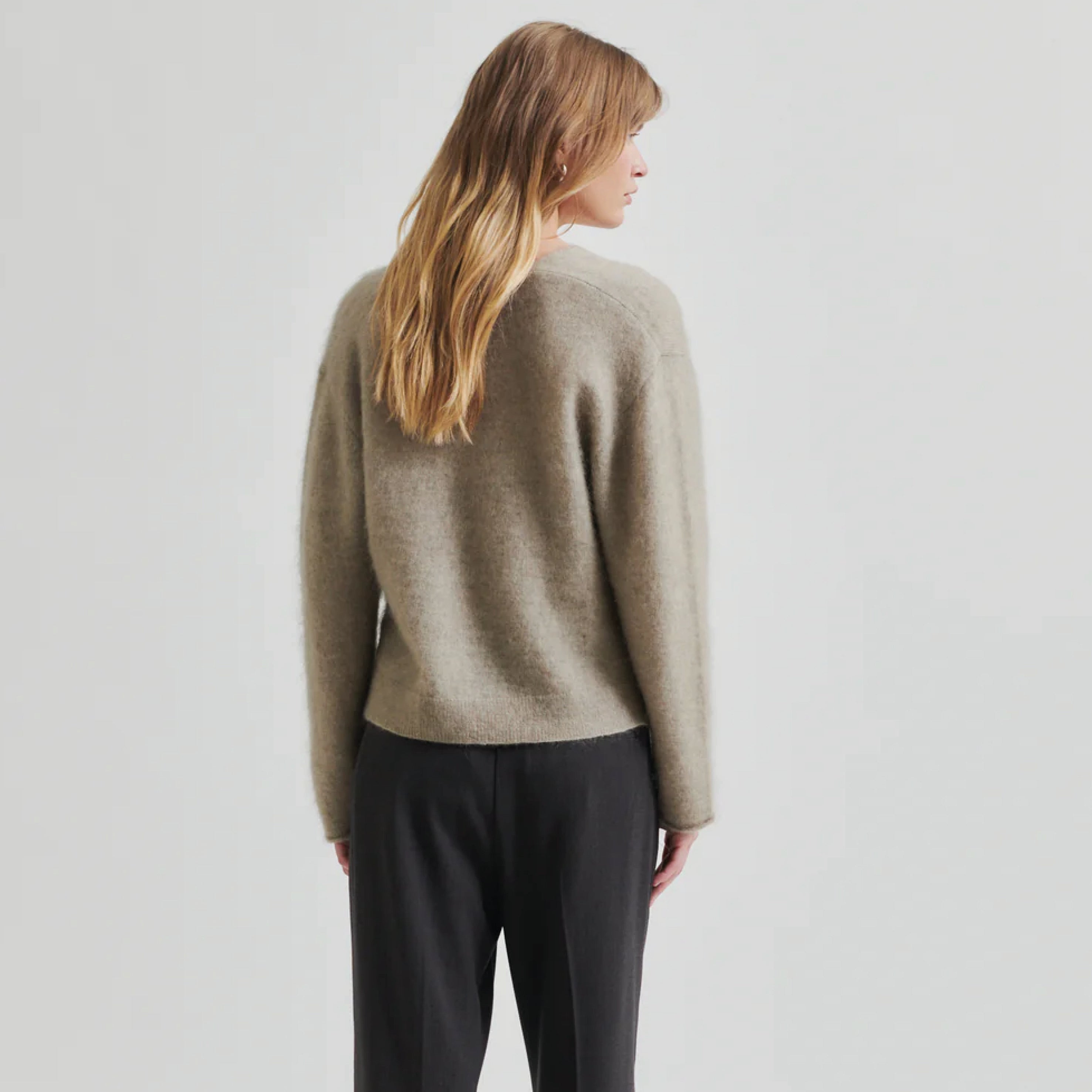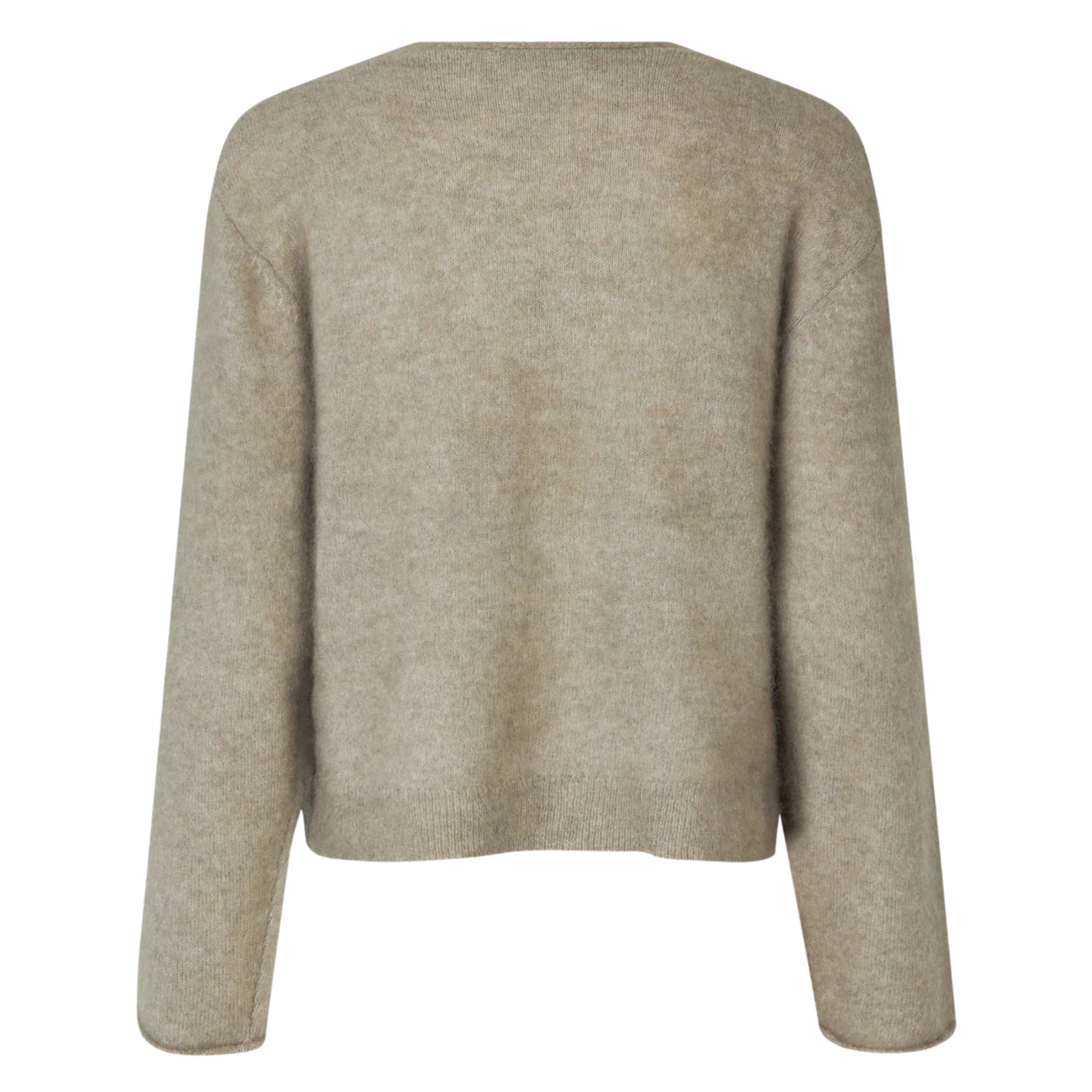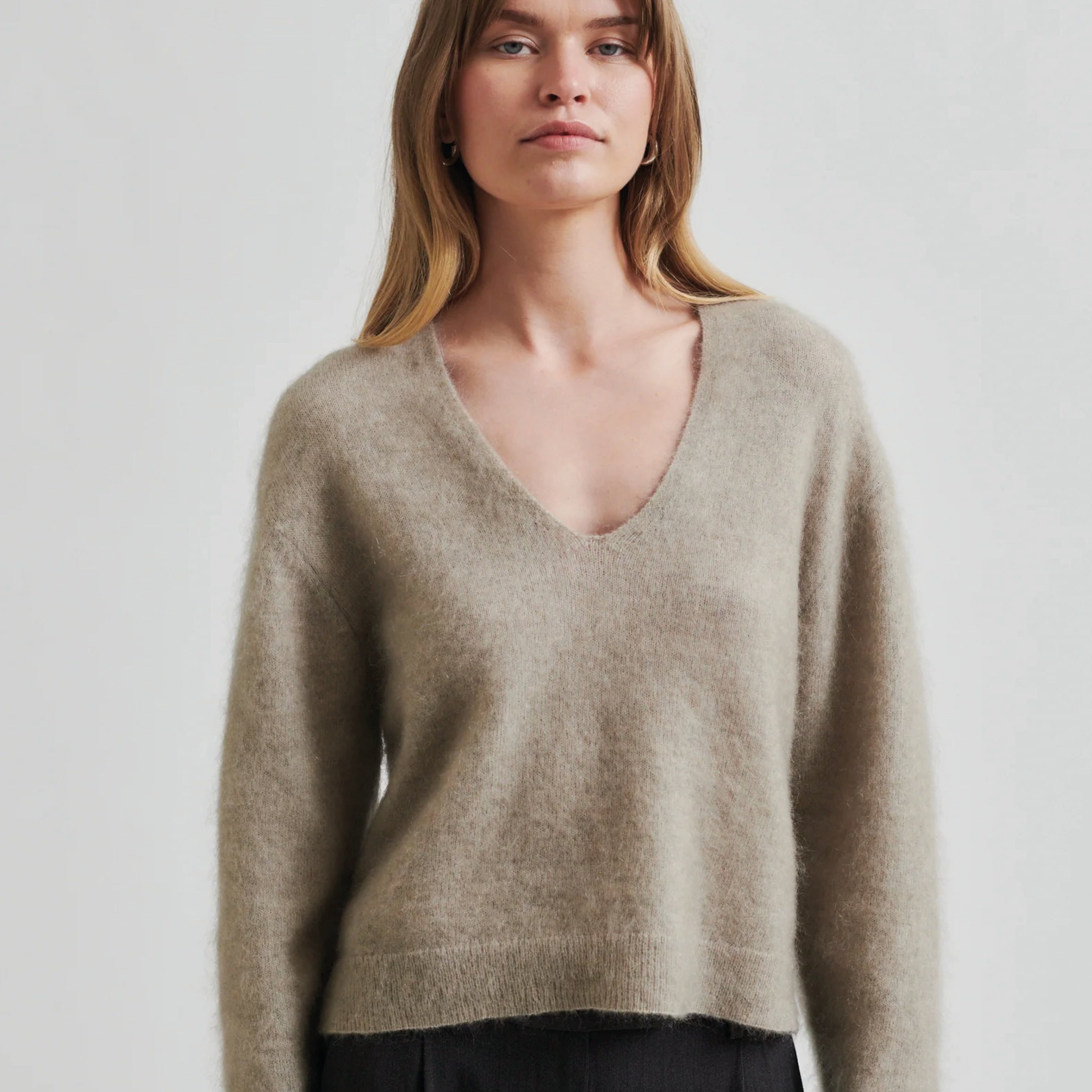 The Second Female Trench Coat Camryn Knit is a luxurious V-neck pullover made in a soft and stretchy mohair blend with a fluffy quality. Featuring a V-neckline and dropped shoulders with long sleeves.