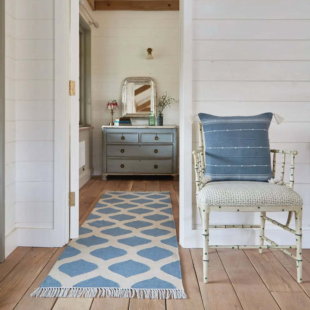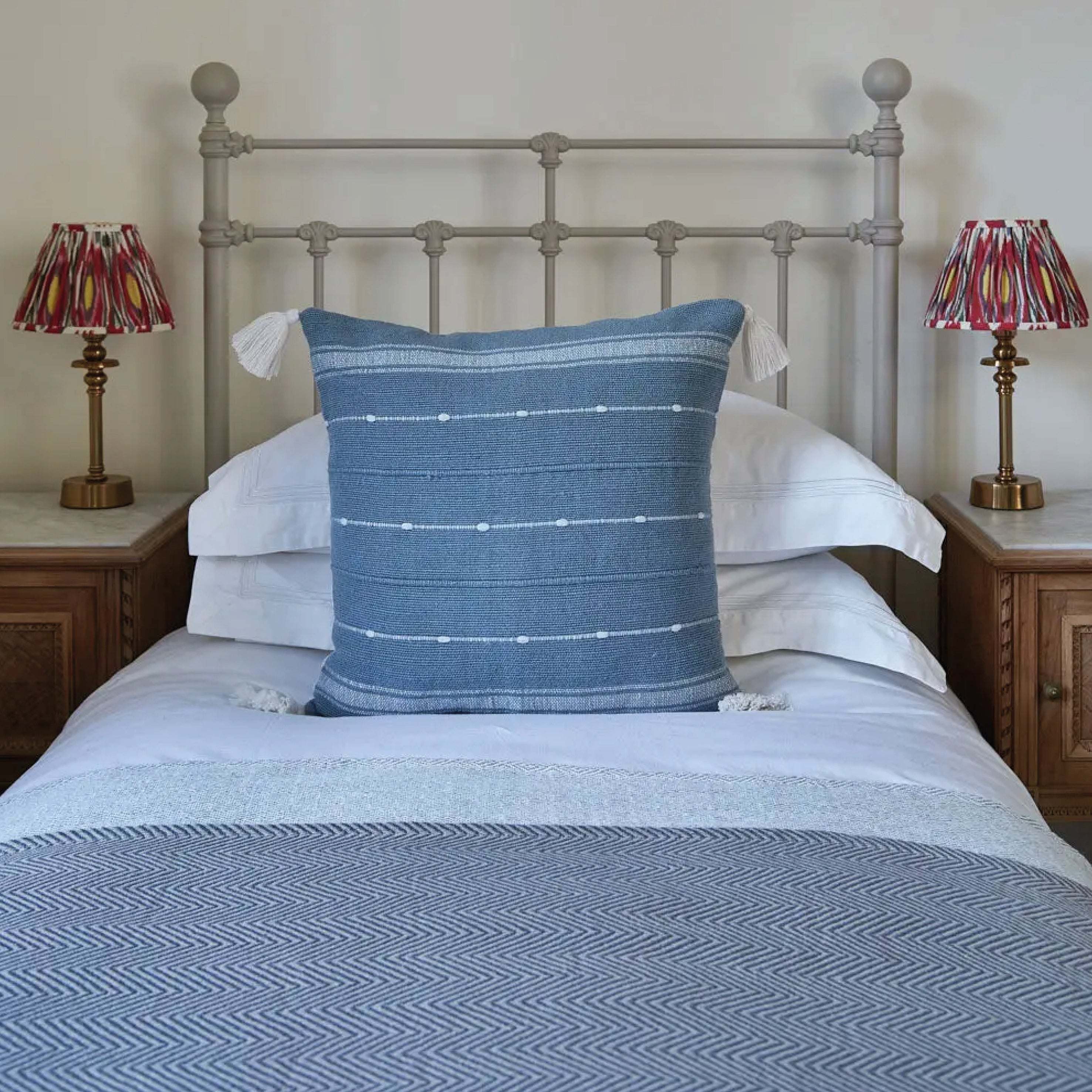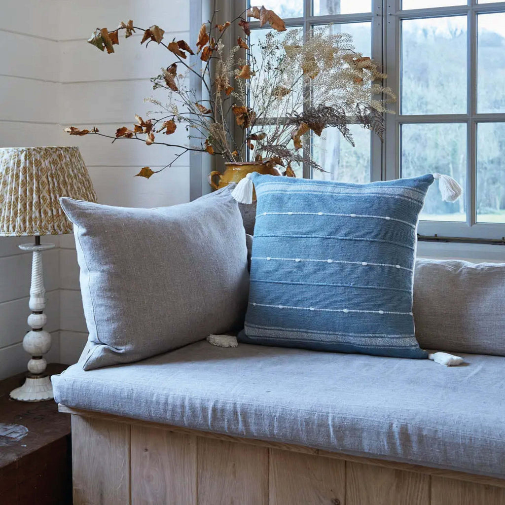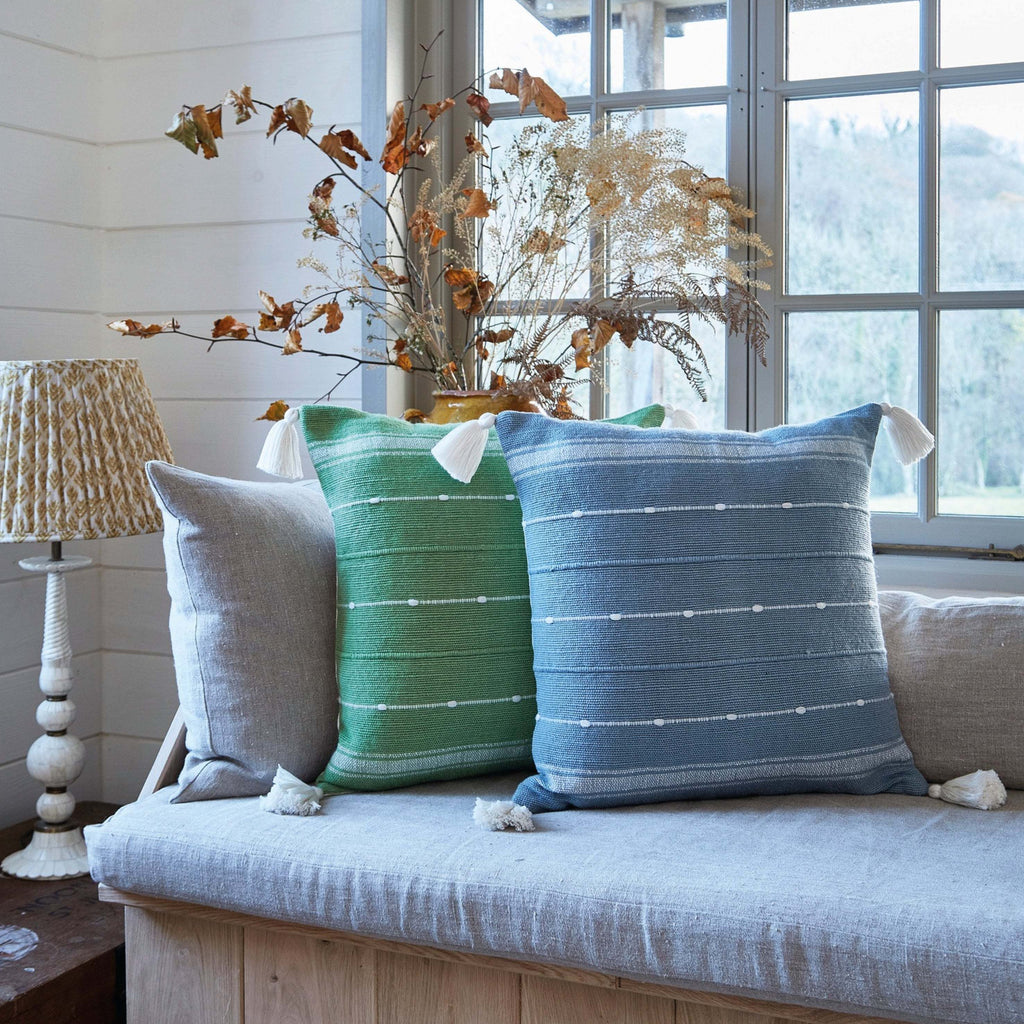 The vibrant Sky Blue Tassel Cushion feature lovely soft tassels and a slub yarn weave in a discreet striped design.