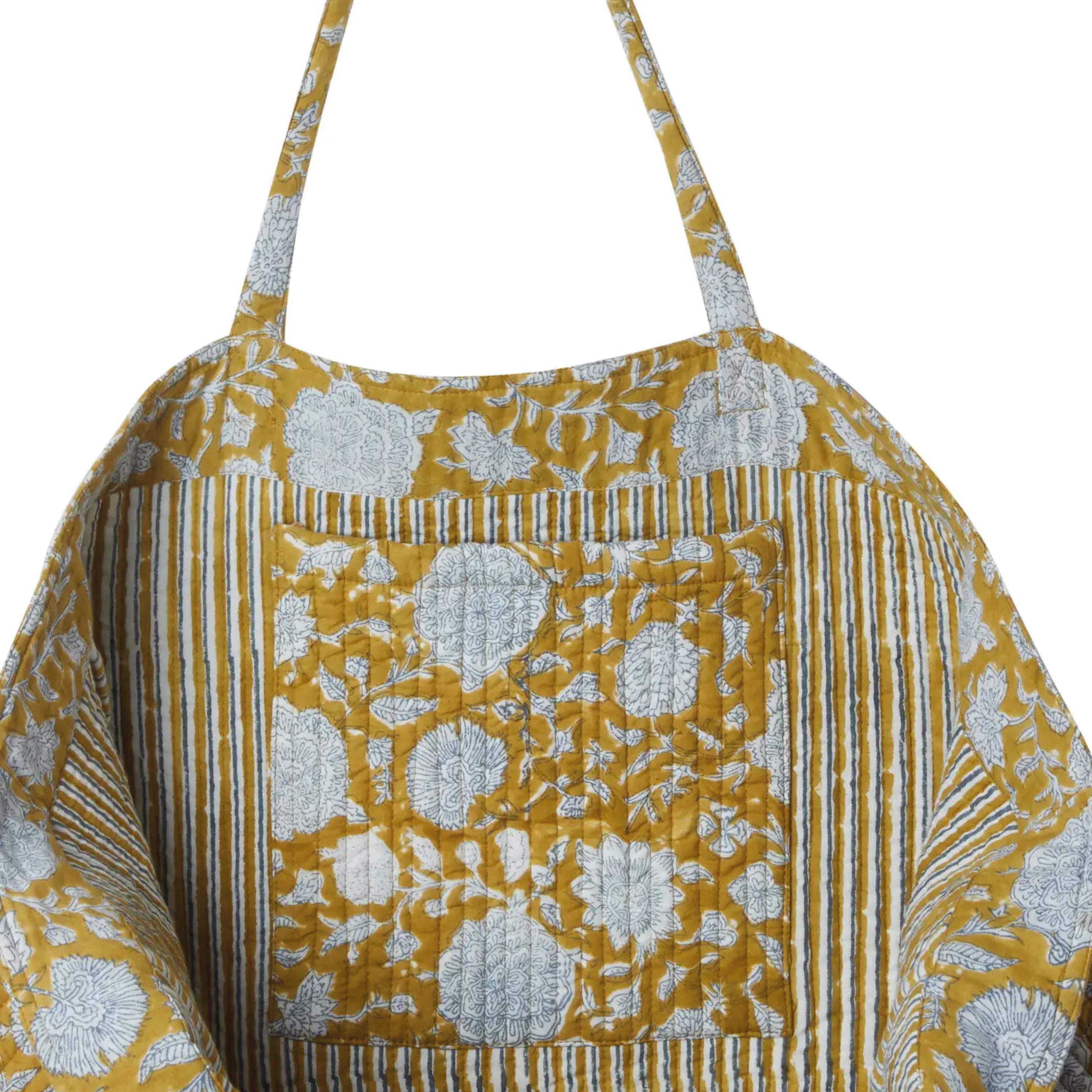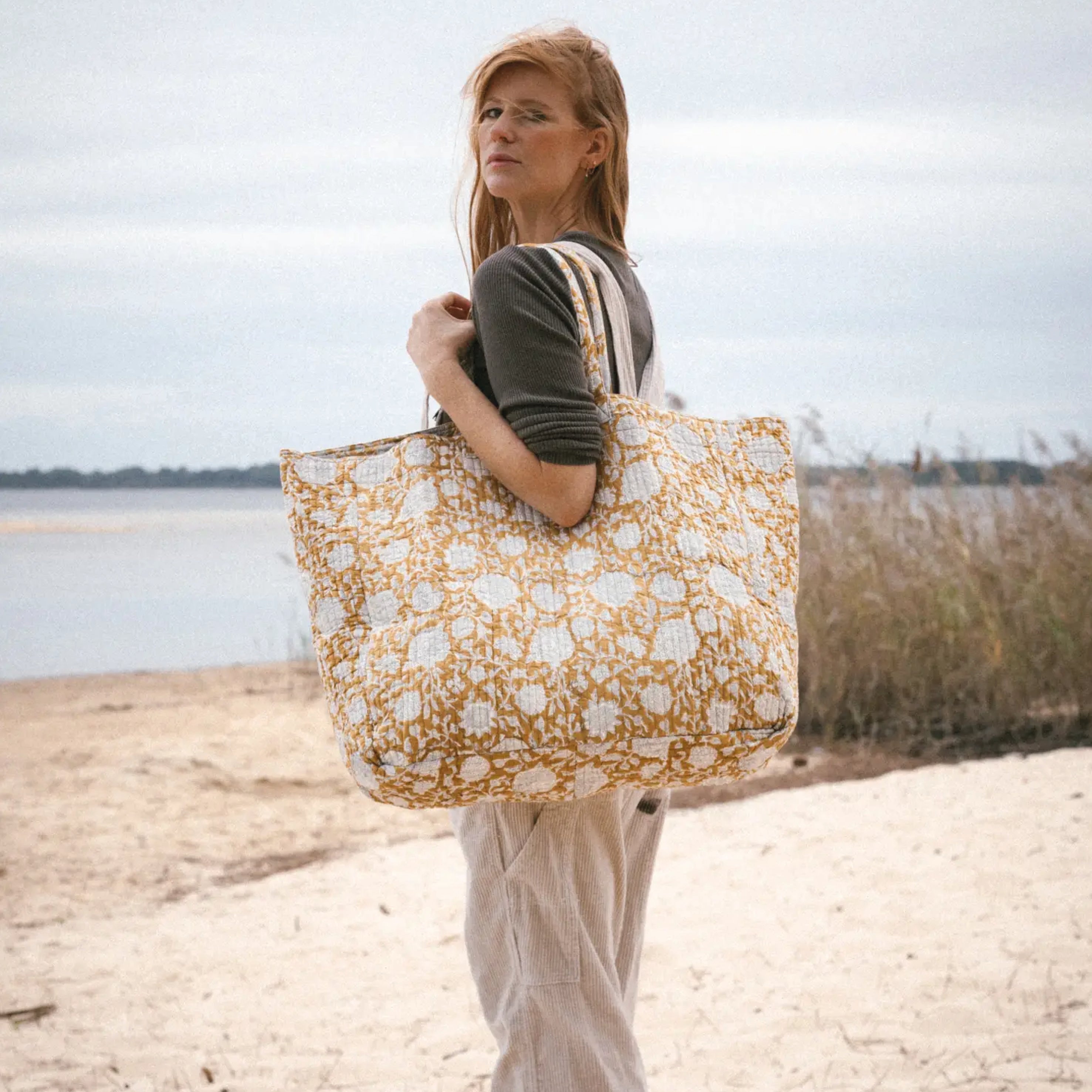The Tupia Absynthe Indian Flowers Shopper Bag is hand-printed using the wooden stamp technique with vegetable dyes made from natural pigments.
